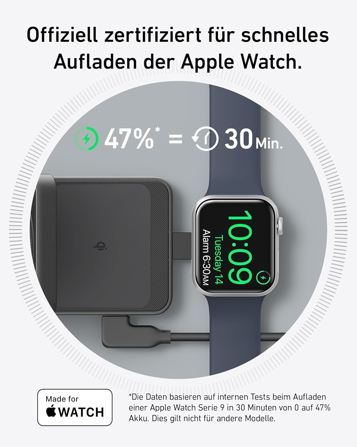 - Erhebliche Zeitersparnis – Ihre Apple Watch Serie 9 erreicht 47 % in nur 30 Minuten dank der MFW-Zertifizierung. Dies ist viel schneller als unzertifizierte Ladegeräte.