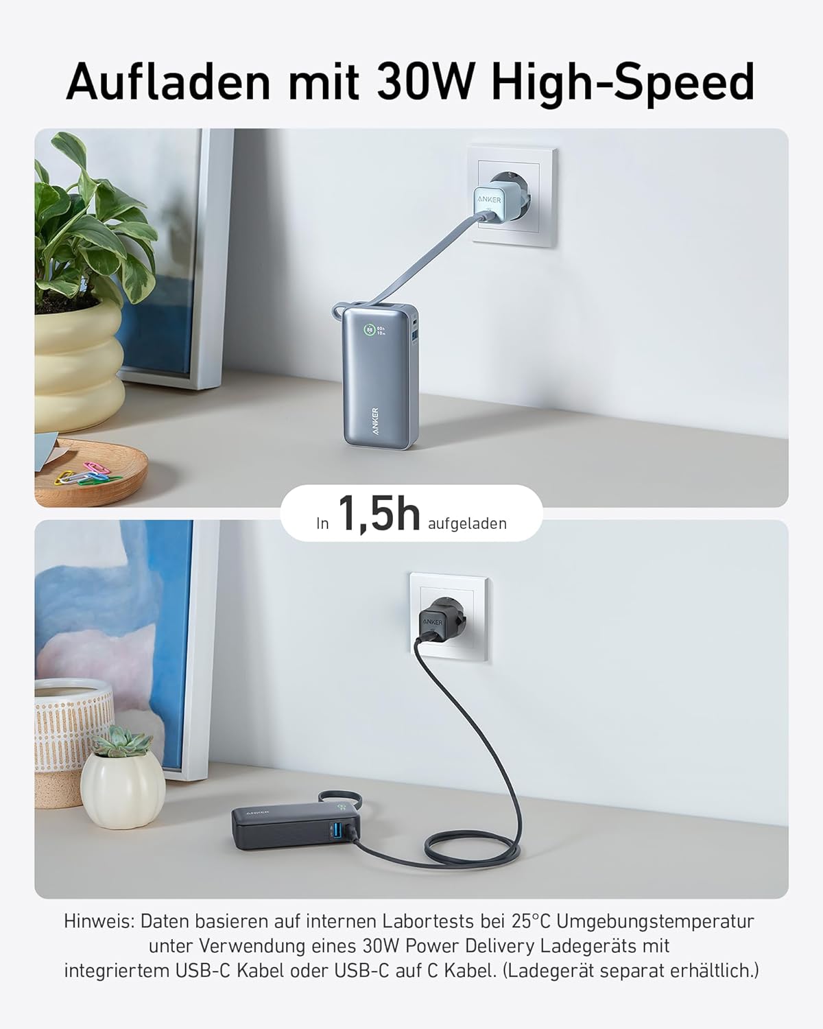 - 30W BI-DIREKTIONALES LADEN: Booste deine Powerbank in nur 45 Minuten auf 50% oder lade dein iPhone 14 in 30 Minuten auf 50% Akku auf, dank 30W Schnellladung in beide Richtungen.