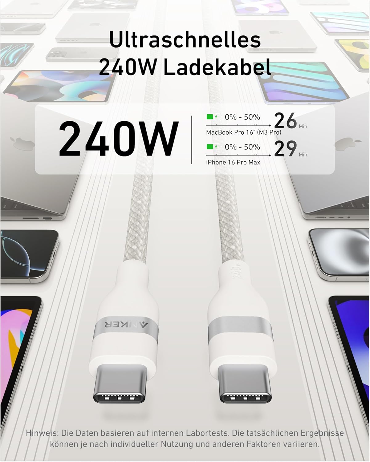 - Blitzschnelles 240W Kabel: Dieses 240W USB-IF zertifizierte Kabel lädt dein 16-Zoll MacBook Pro (2023) in nur 28 Minuten auf 50% Akku oder dein iPhone 15 Pro in 26 Minuten auf 50% Akku auf. (Hinweis: Dieses Kabel unterstützt kein Bildschirmspiegeln.)