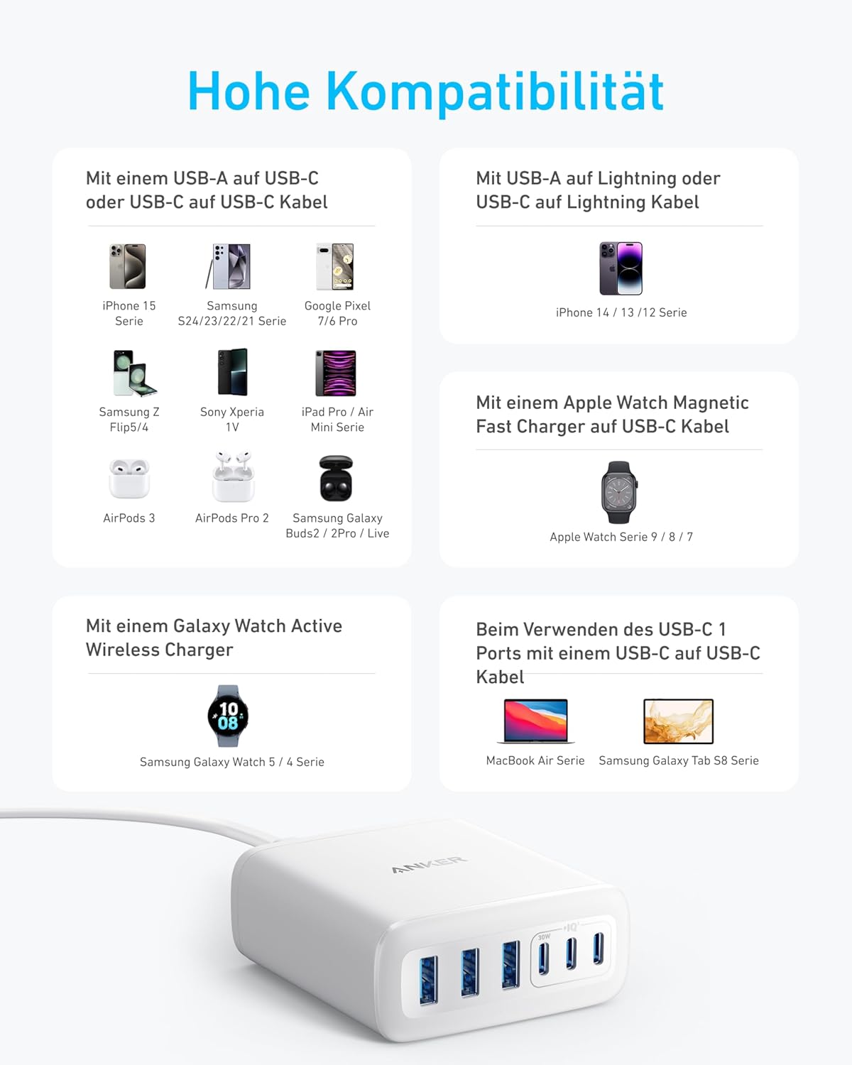 Anker USB-C Ladegerät, 6 Port Ladestation mit 112W Ausgang Leistung, Für iPhone 16/16 Plus/16 Pro/16