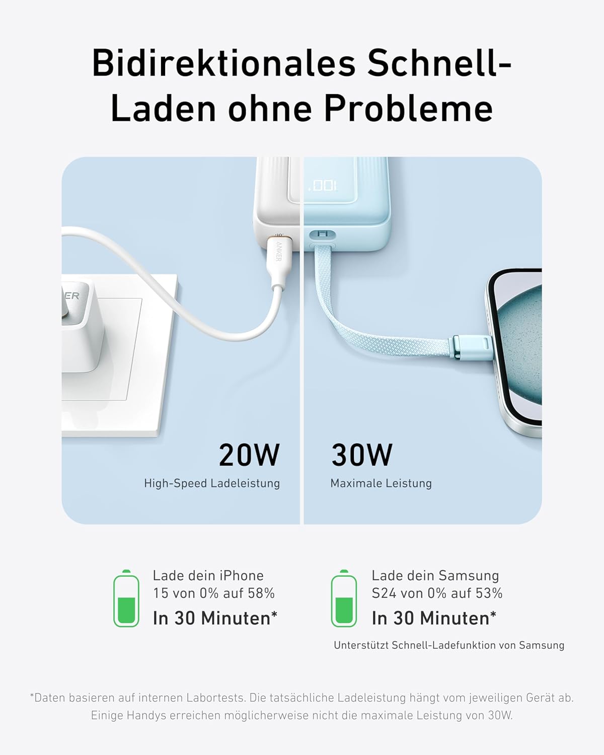 - Schnelles Laden mit 30W: Mit der innovativen Schnellladetechnologie und 30W Leistung lädst du dein iPhone 15 in 30 Minuten von 0 auf 57% auf.