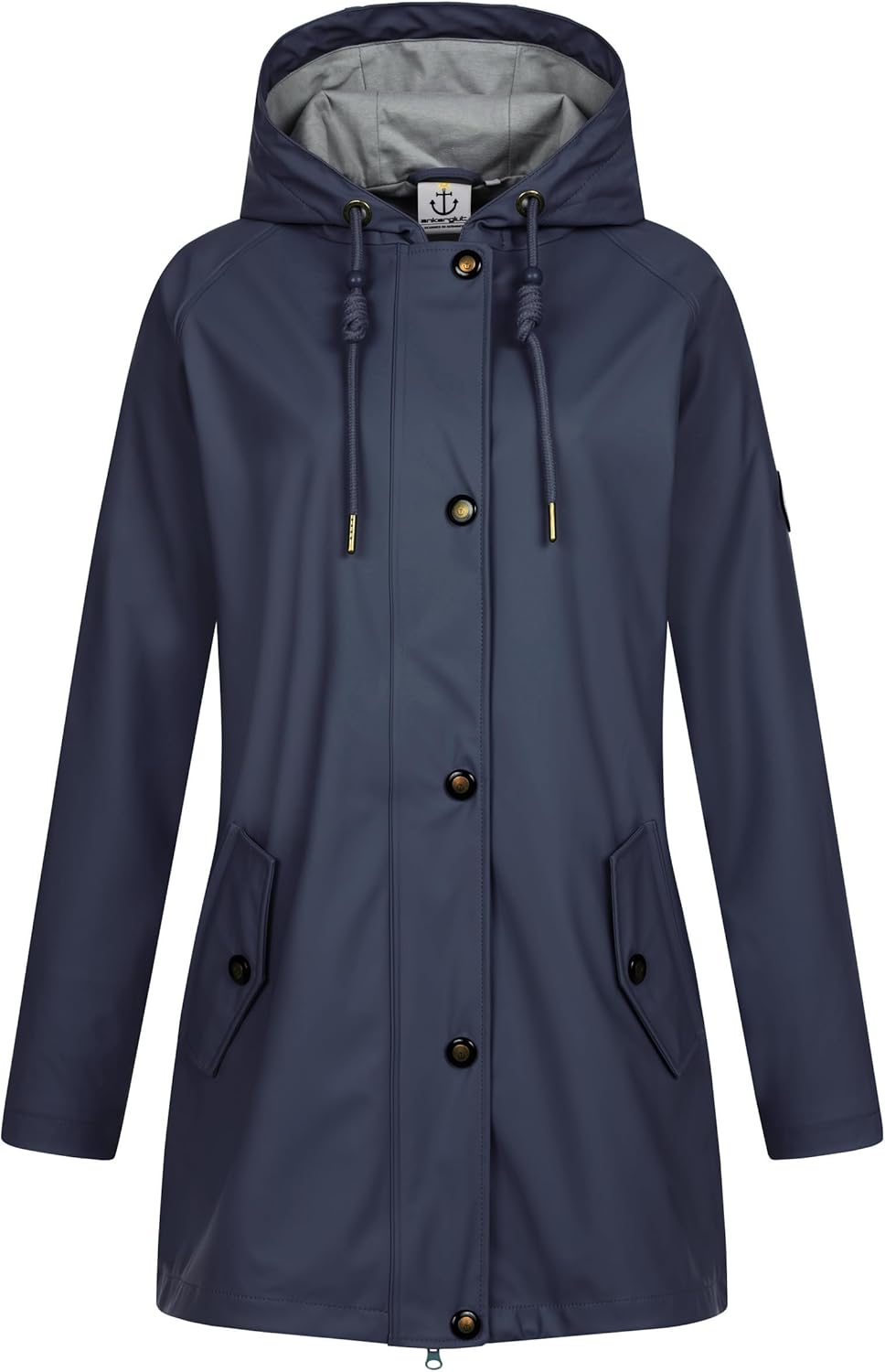 PRODUKTBESCHREIBUNGEN Wolkenvorhang auf für unsere neue Damen Regenjacke #ankerglutheaven WOMEN ! Wenn das Wetter mal wieder die grosse Regenvorstellung startet, dann bist du damit bestens gerüstet. Die maritime Regenjacke im klassischen Stil eines Friesennerzes sorgt auch an grauen Tagen für gute Laune. Das wasserdichte Aussenmaterial ist an den Nähten verschweisst und bietet verlässlichen Regenschutz. Die Innenseite ist mit einem herrlich soften Jerseyfutter ausgestattet und sorgt für ein angenehmes Tragegefühl. Dank Taftfutter in den Ärmeln gleitest du ganz einfach in die Jacke, ohne dass Ärmel von Bluse oder Pullover nach oben rutschen. Die Kapuze ist mit einer farblich abgestimmten Kordel versehen. Der Reissverschluss kann in beide Richtungen geöffnet werden. Zusätzlich wird er von einer Windschutzblende geschützt. Die beiden äusseren Eingrifftaschen können mit Druckknopf verschlossen werden. Eine innenliegende Brusttasche bietet ausreichend Platz für ein Smartphone. Die Weite der figurumspielenden Jacke kann mit einem elastischen Kordelzug am unteren Saum reguliert werden. Liebevolle Labeldetails wie Ärmelpatch, aussergewöhnliche Druckknöpfe und kleine versteckte Botschaften warten darauf, von dir entdeckt zu werden.