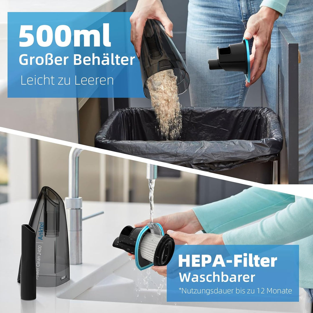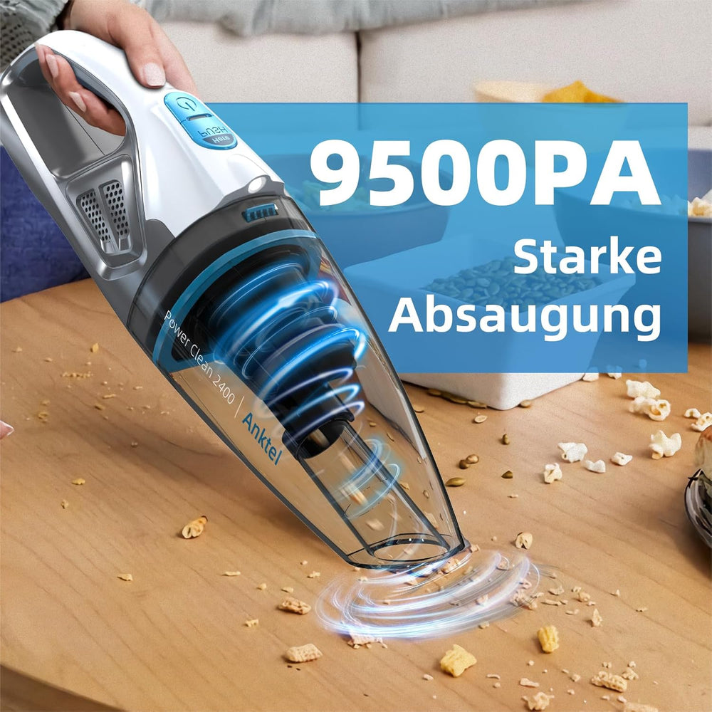 - 【9000Pa Starke Reinigungsleistung】Dank der kraftvollen 9000Pa saugkraft der Anktel-Power Clean 2400 Staubsauger saugt schnell und mühelos Staub und Flüssigkeiten. Ob bei Krümeln, Staub oder Tierhaaren, der Handstaubsauger Power Clean 2400 nimmt