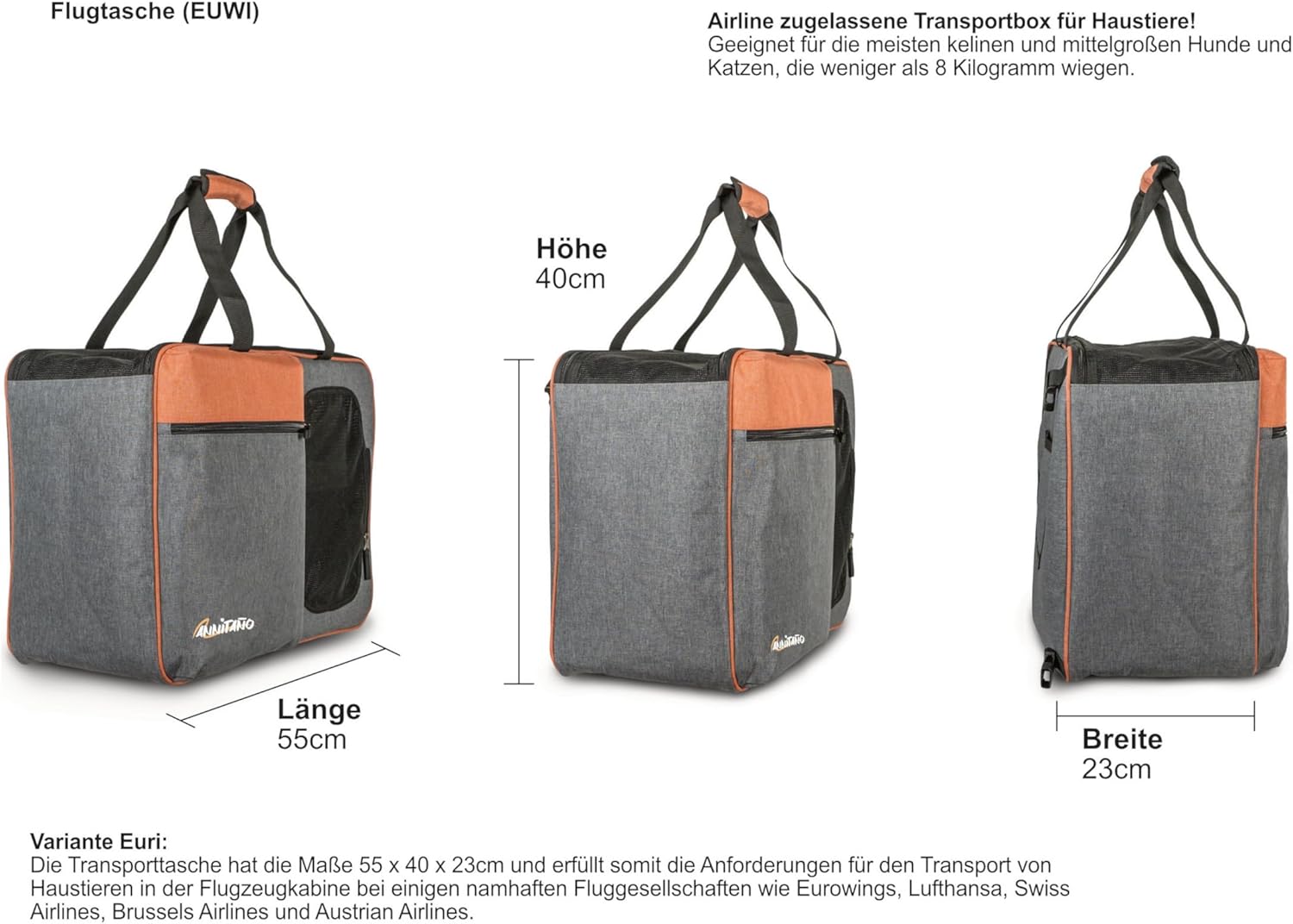 - Perfekte Grösse für Flugreisen: Diese Hundeflugtasche mit den Massen 55x40x23 cm ist ideal für die meisten Fluggesellschaften und bietet Platz für kleine bis mittelgrosse Haustiere bis zu 12 kg.