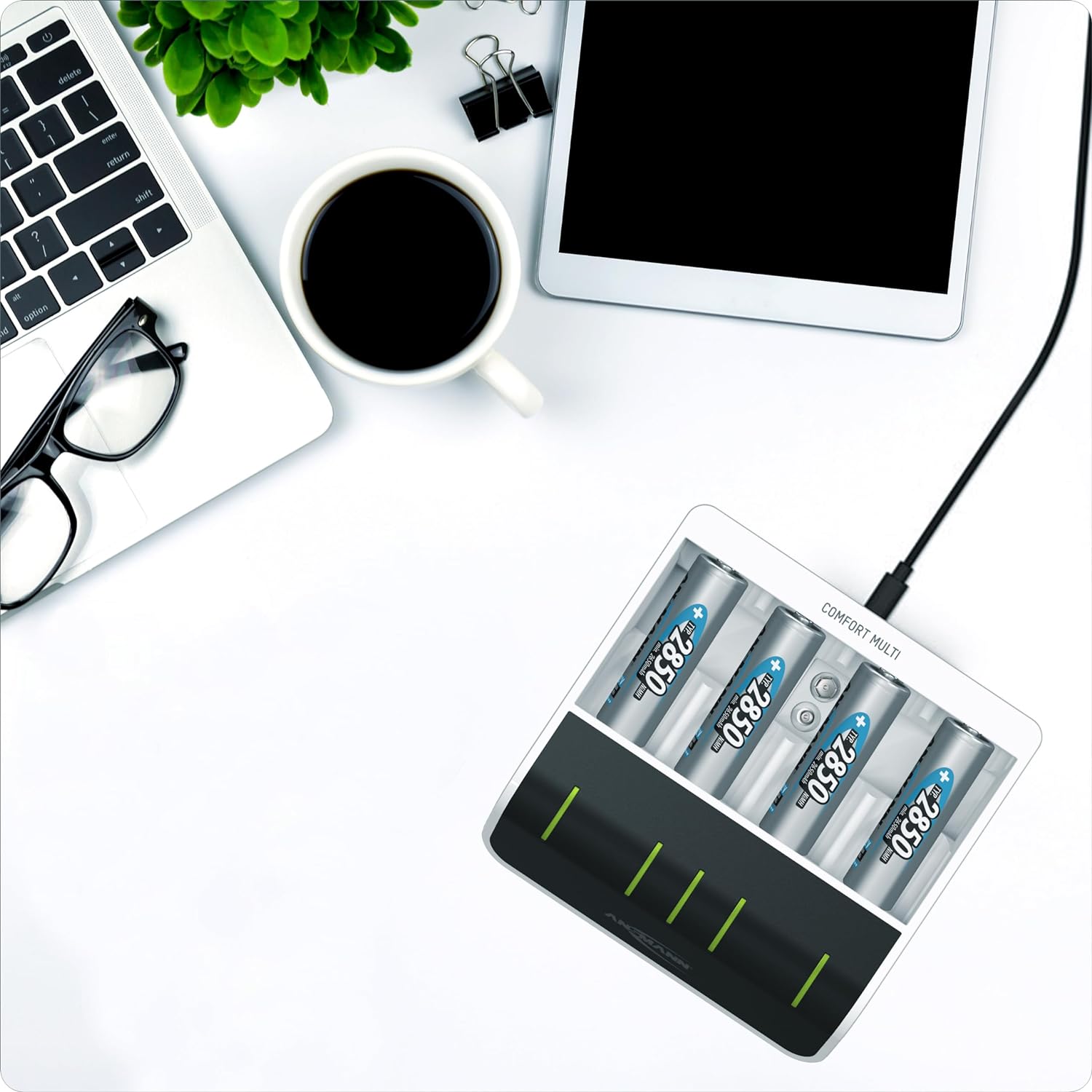 - INTELLIGENTES Akkuladegerät lädt vollautomatisch und stoppt, wenn die eingelegten Akkus vollgeladen sind. Lädt unabhängig von Anzahl oder Ladestand der eingelegten Akkubatterien dank Einzelschachtüberwachung