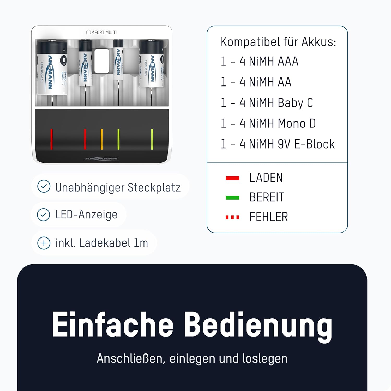- KOMPATIBEL mit 1-4 NiMH Akkus der Grössen AA/Mignon/HR6, AAA/Micro/HR03, C/Baby/HR14, D/Mono/HR20 & ein 9V E-Block; Die Erhaltungsladung hält die Akkuladung bei 100%, so sind die Akkus immer einsatzbereit und können in der Ladestation verbleiben
