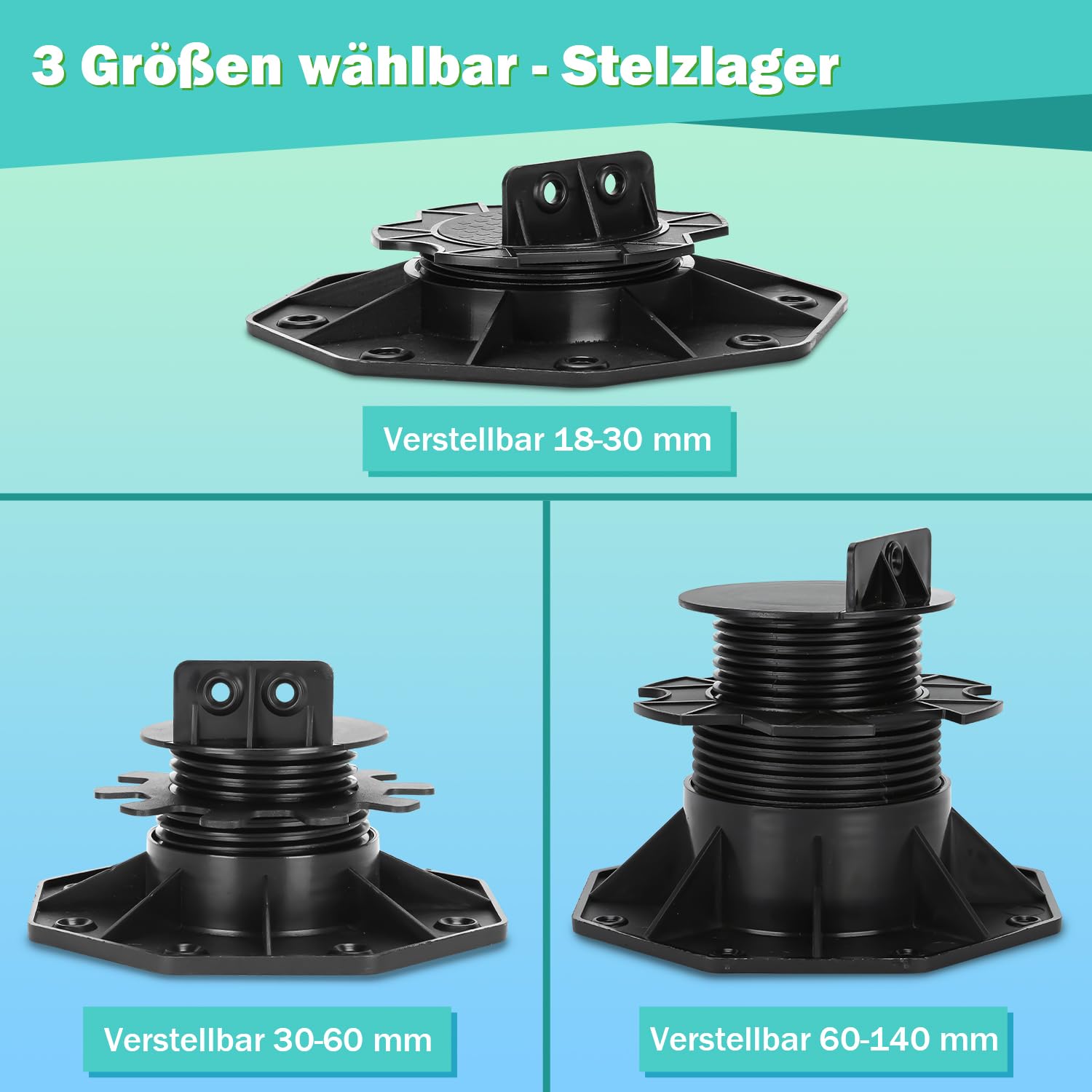 - Höhenverstellbar ,stufenlos höhenverstellbar von 18 - 30 mm, Mit dem Terrassenlager wird durch einfaches Links-/Rechtsdrehen stufenlos das Höhenniveau eingestellt.
