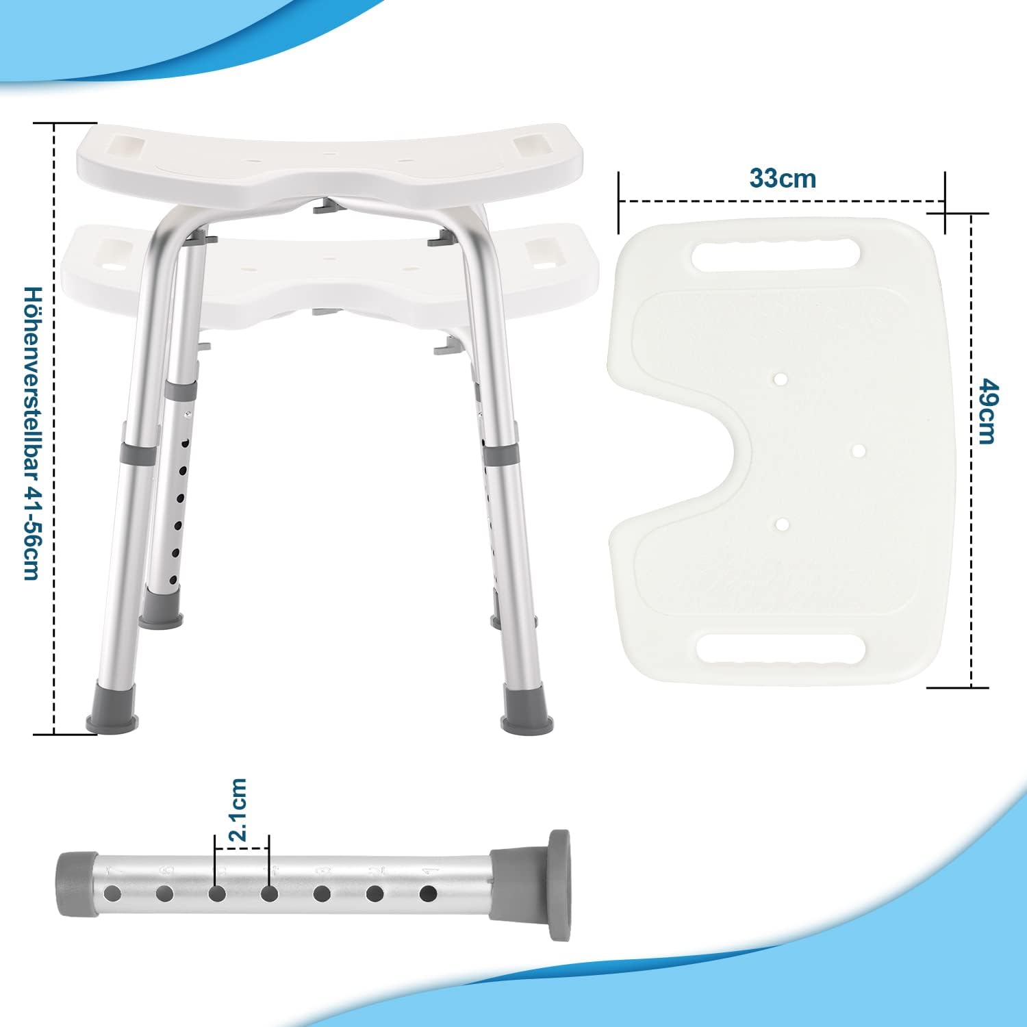 - 🚿Duschhocker Spezifikation Farbe: Weiss, Material: Aluminium und Polyethylen hoher Dichte, getestet bis zu einer Belastung von 136 kg. Extra breiter Sitz: 51*26cm, Sitzhöhe: 41-56cm, Gewicht: 2.3kg