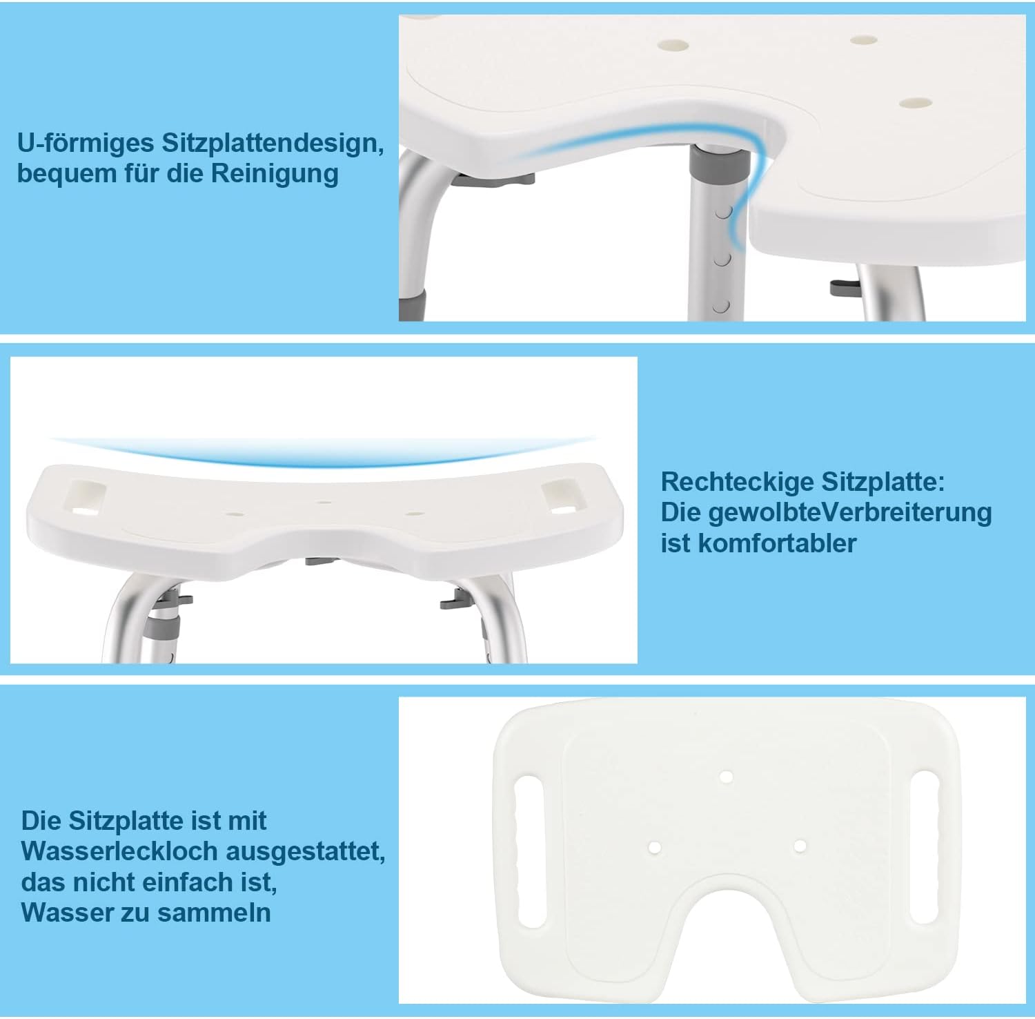 - 🚿Komfortables Design: Das U-förmige Design Duschstuhl mit Hygieneausschnitt und der rechteckige Sitz ermöglichen es dem Benutzer, bequem auf dem Duschhocker zu sitzen und eine umfassende Körperreinigung durchzuführen.