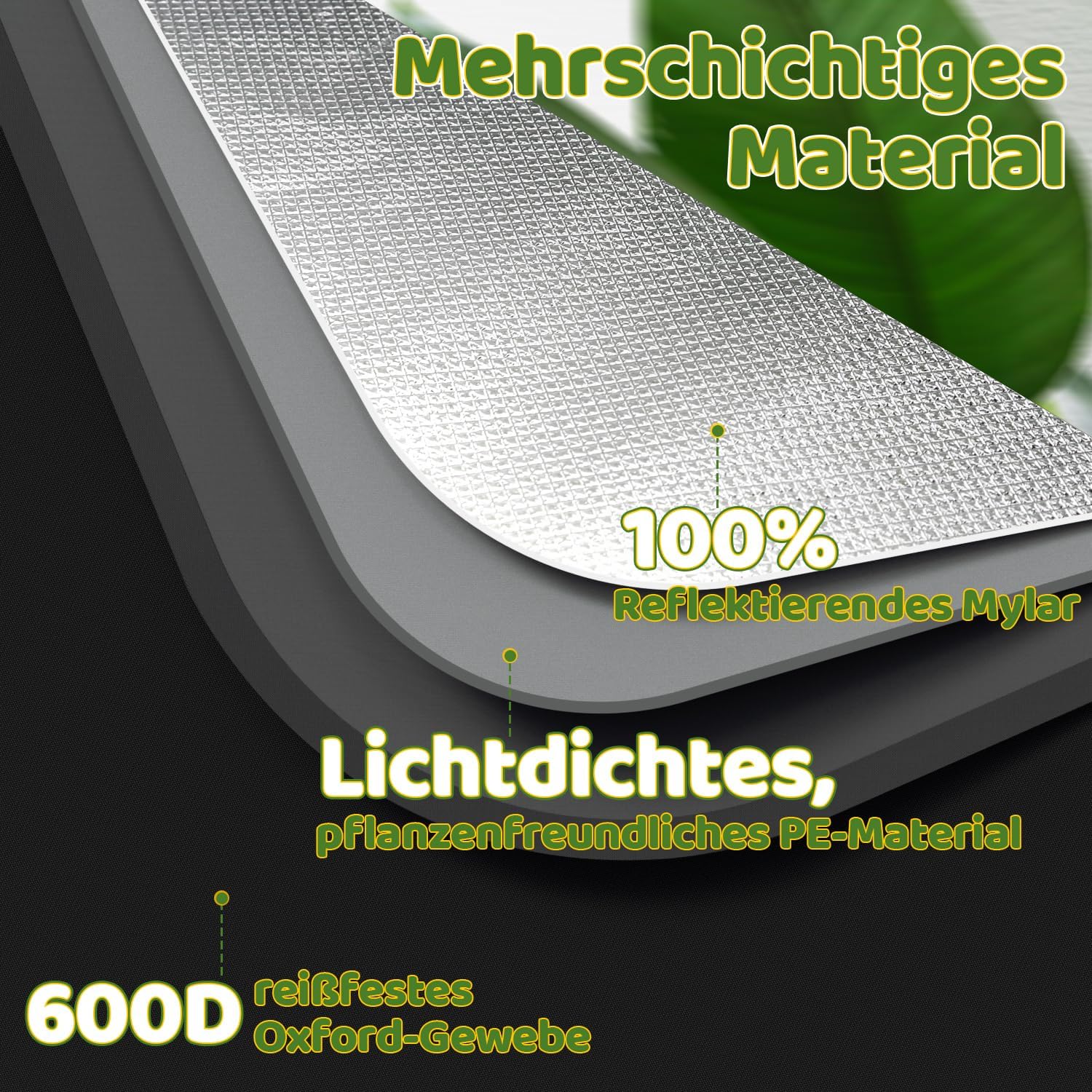 • 【Hochwertiges Material】Unsere growzelt bestehen aus Schwarzer Stoffbezug Oxford 600D, reissfest, schwer entflammbar und 99,9 % lichtundurchlässig, umweltfreundlichem und ungiftigem, reflexionsfolie innen für eine Lichtreflektion von 95%.