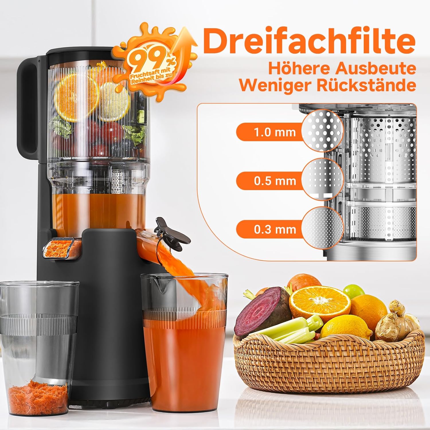- Dreifachfilter & Spiralsystem – Hohe Saftausbeute garantiert Dank automatischer Schneid-Spirale erzielt der entsafter gemüse und obst testsieger bis zu 95% Saftausbeute – geeignet für Sellerie, Rote Beete, Trauben u.v.m. Ein echter juicer