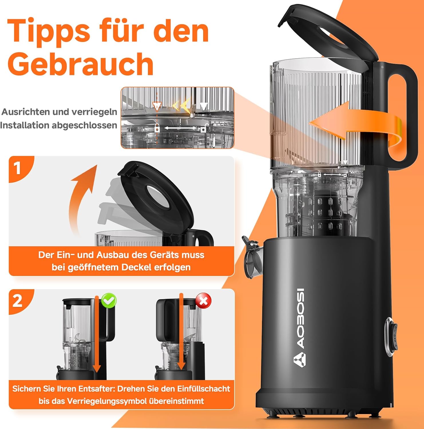 - 126MM Einfüllöffnung – Mehr Obst, weniger Aufwand Der neue Aobosi entsafter slow juicer verfügt über eine 126MM breite Öffnung – ideal für ganze Äpfel, ohne Vorschneiden. Damit wird Ihr slow juicer testsieger zum praktischen Alltagshelfer bei