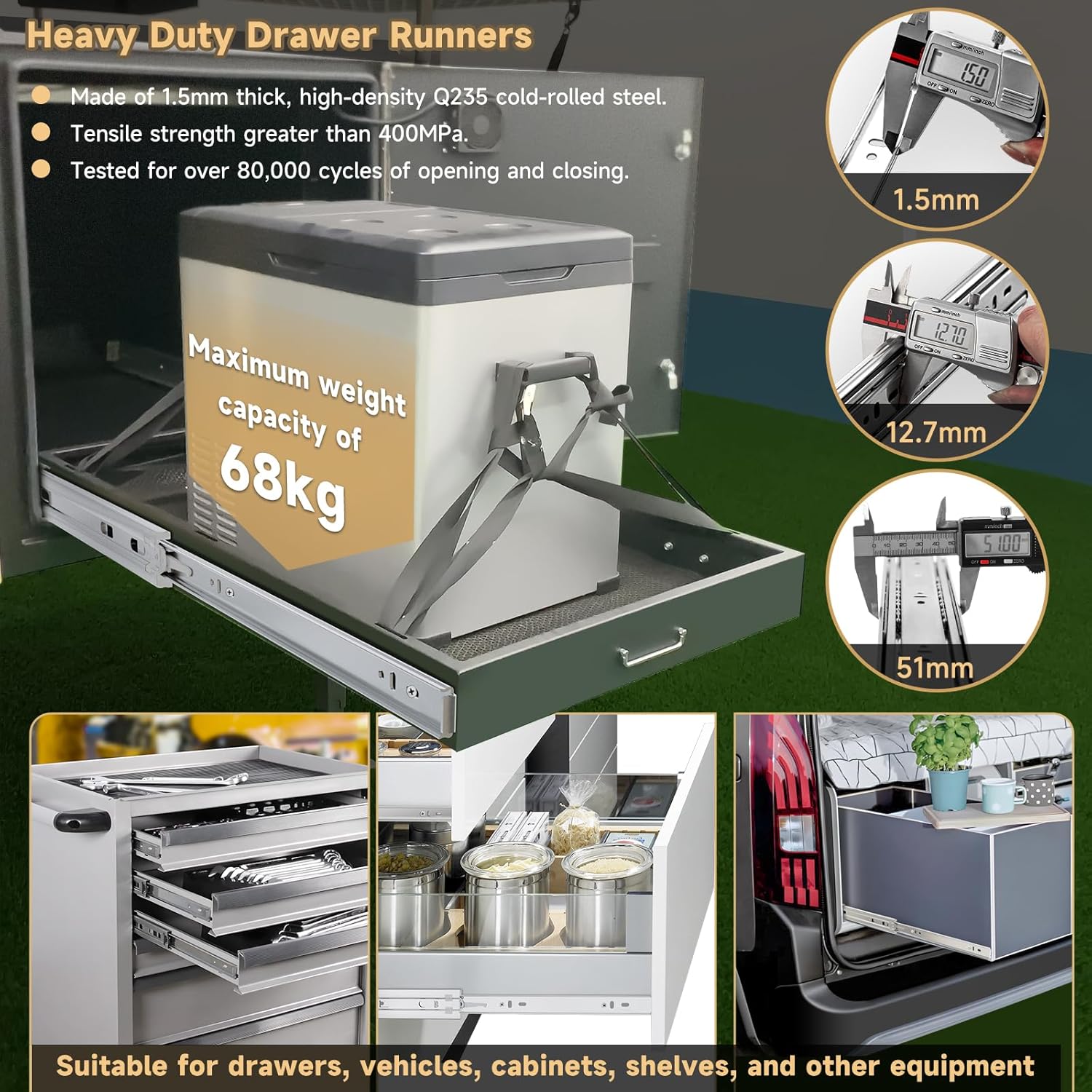 - 【Schwere Schubladenführung】:Grösse: 24" (600mm)- -Installationsdicke: 0,5"/12,7mm (jeweils)- -Breite: 2"(50mm)- -Tragfähigkeit: 50 kg - -Vollständig ausgefahrene Länge: 48 "---Lieferumfang: Schubladenführung 2er Set (1 Paar Schienen)