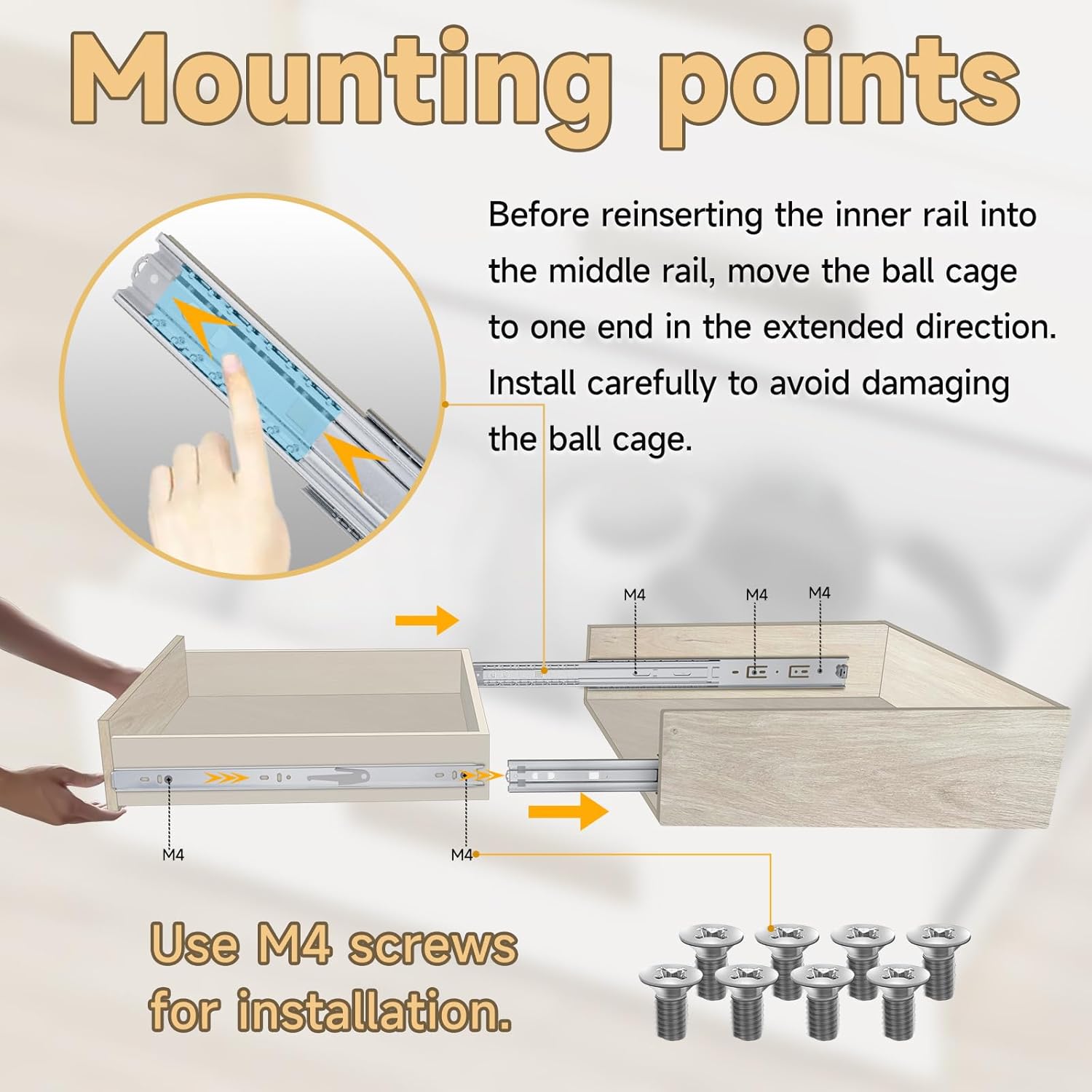 - 【Abnehmbare Schubladenführung mit Vollauszug】: Auf der Rückseite der inneren Schiene befindet sich eine Kunststoffschnalle, die durch Drücken und Herausziehen entfernt werden kann Kollision während des Gebrauchs, Geräuschreduzierung.