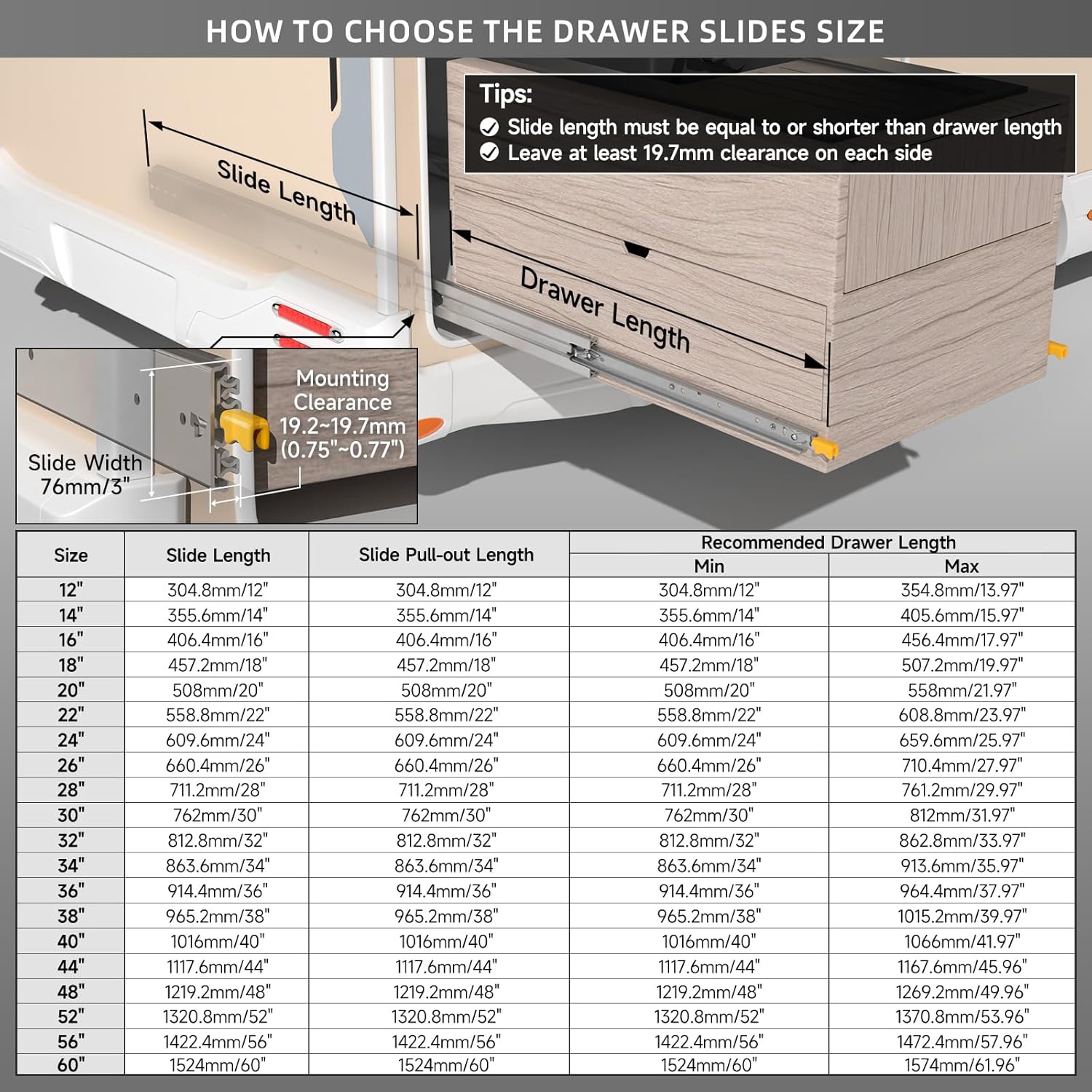 - 🌟【Runner Halterung 】: Der Einbauraum auf beiden Seiten der Schublade muss 19 mm * 2(0,75 Zoll * 2) betragen. Länge: 38 Zoll (950 mm)。 Geeignet für lange Schranktiefen von 38-40 Zoll (950-1000 mm) .Hinweis: Schrauben sind nicht im