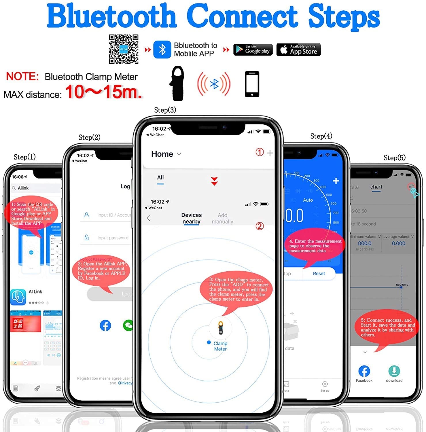 - 【Bluetooth Amp Meter】 Dieses Zangenmessgerät kann mit dem Mobiltelefon über Bluetooth verbunden werden, Auto-Paar mit Android / IOS Telefon über Bluetooth in der Nähe, es ist einfach zu installieren, scannen Sie einfach den QR-Code oder suchen