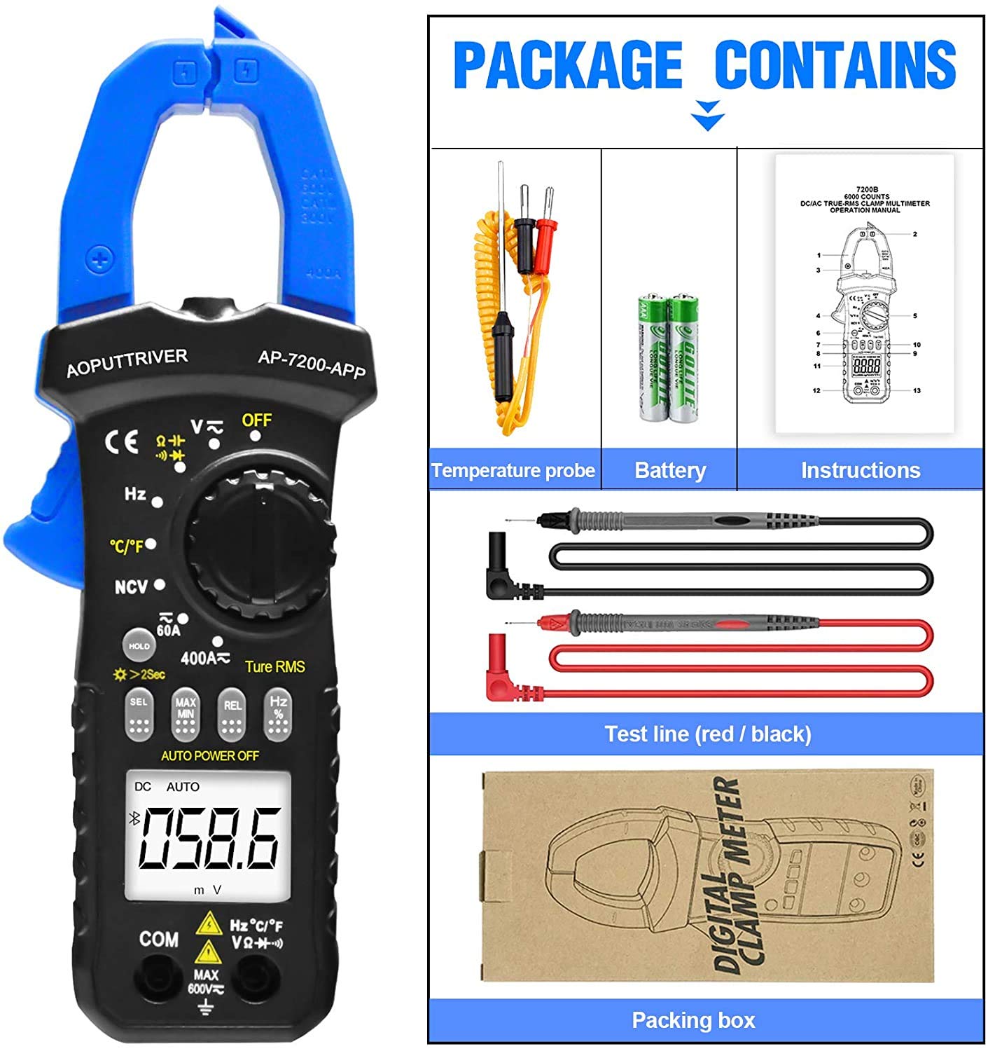 - 【Multifunktions-Klemmenmessgerät】 6000 Counts Auto-Bereich AC/DC Ampere Zangenmultimeter mit dem DC-Spannungsbereich:600mV~600V, AC-Spannungsbereich:6V~600V, AC/DC Strom: 60A~400A; Widerstand:600Ω~60MΩ; Ideal Berührungsloses Ampere-Multimeter zur