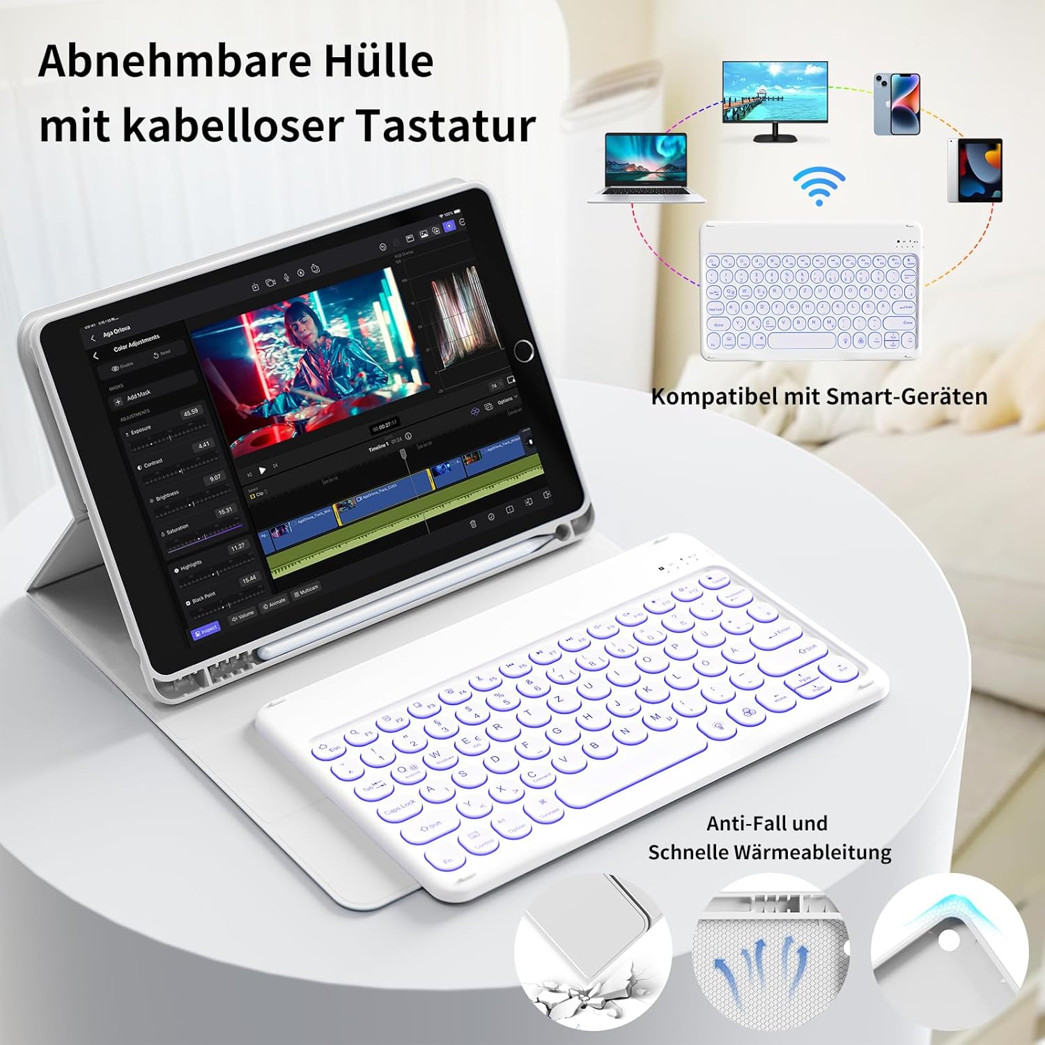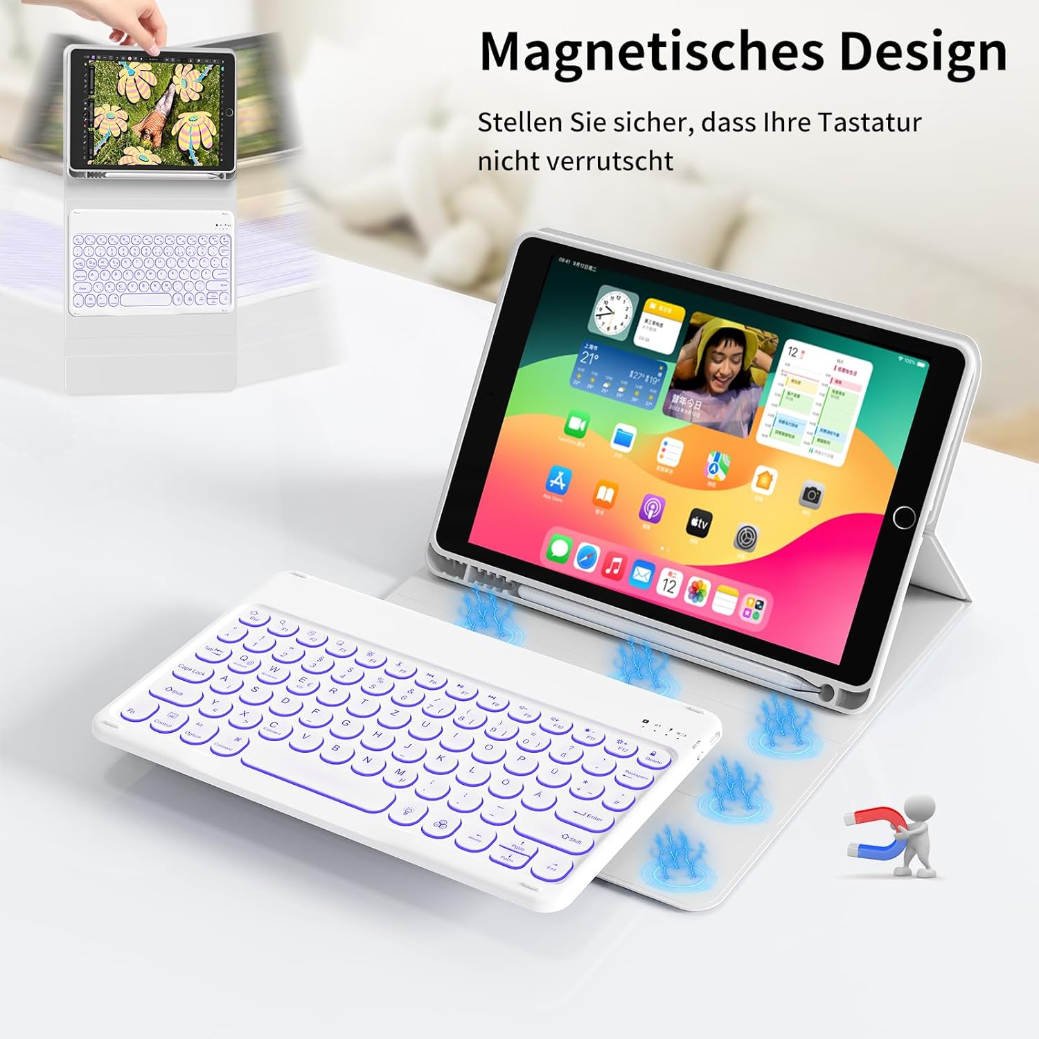 - 【Magnetische abnehmbare Tastatur】 Konkave Tastatur für ein angenehmeres Handgefühl. Die Tastatur ist mit einer breiten Palette von Smart-Geräten kompatibel, die eingebaute Lithium-Batterie kann in 2-3 Stunden vollständig aufgeladen werden, mit
