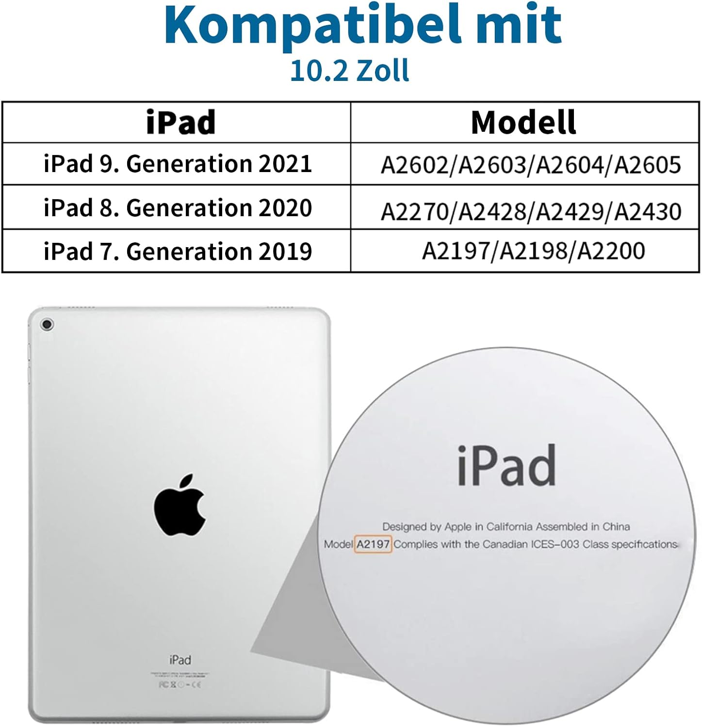 - 【Hülle mit Tastatur für iPad 10,2 Zoll】 Diese kabellose Tastaturhülle ist geeignet für iPad 9. Generation 2021 (A2602, A2603, A2604, A2605), iPad 8. Generation 2020 (A2270, A2428, A2429, A2430), iPad 7. Generation 2019 ( A2197, A2198, A2200),