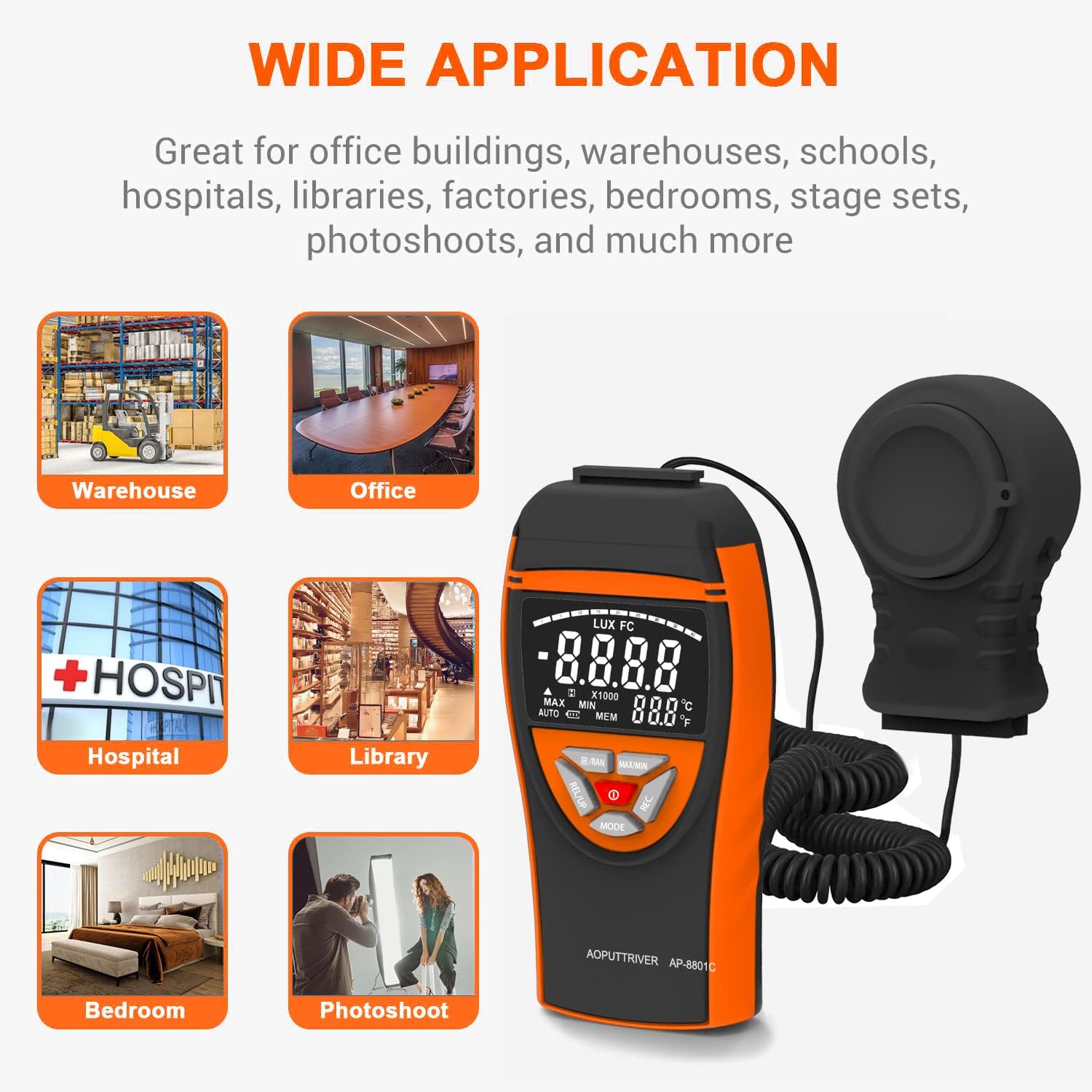 - 😊【Hervorragende Leistung】Messbereich des AP-8801C-Belichtungsmessers bis zu 400.000 Lux / 40.000 FC. ± 4% rdg + 1,0% fs (weniger als 10.000 Lux / 1.000 FC) / ± 5%rdg+ 1,5% fs (mehr als 10.000 Lux / 1.000 FC); Auflösung: 0,1 Lux / 0,01 Fc; Messgeschwindigkeit: 2 mal / Sekunde.