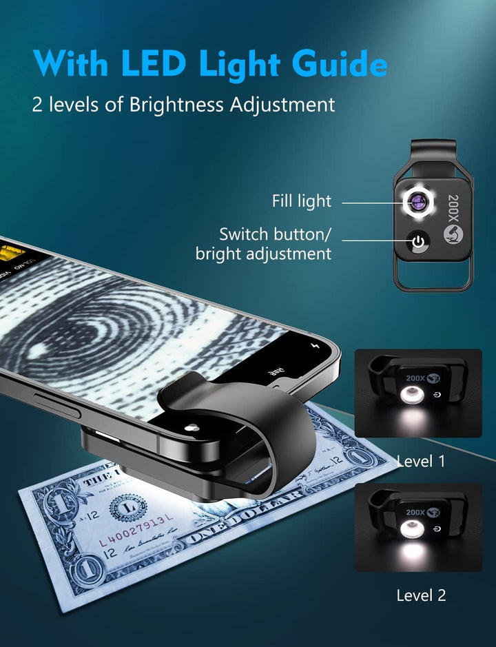 - Einfache Verwendung und kleine Tipps: Einfach den Mikroskop-Clip auf Ihre Telefonkamera einstellen, mit Ihrer Handy-Hauptkamera ausrichten. Wenn es einen schwarzen Kreis auf dem Bildschirm gibt, vergrössern Sie bitte den Bildschirm des Handys und