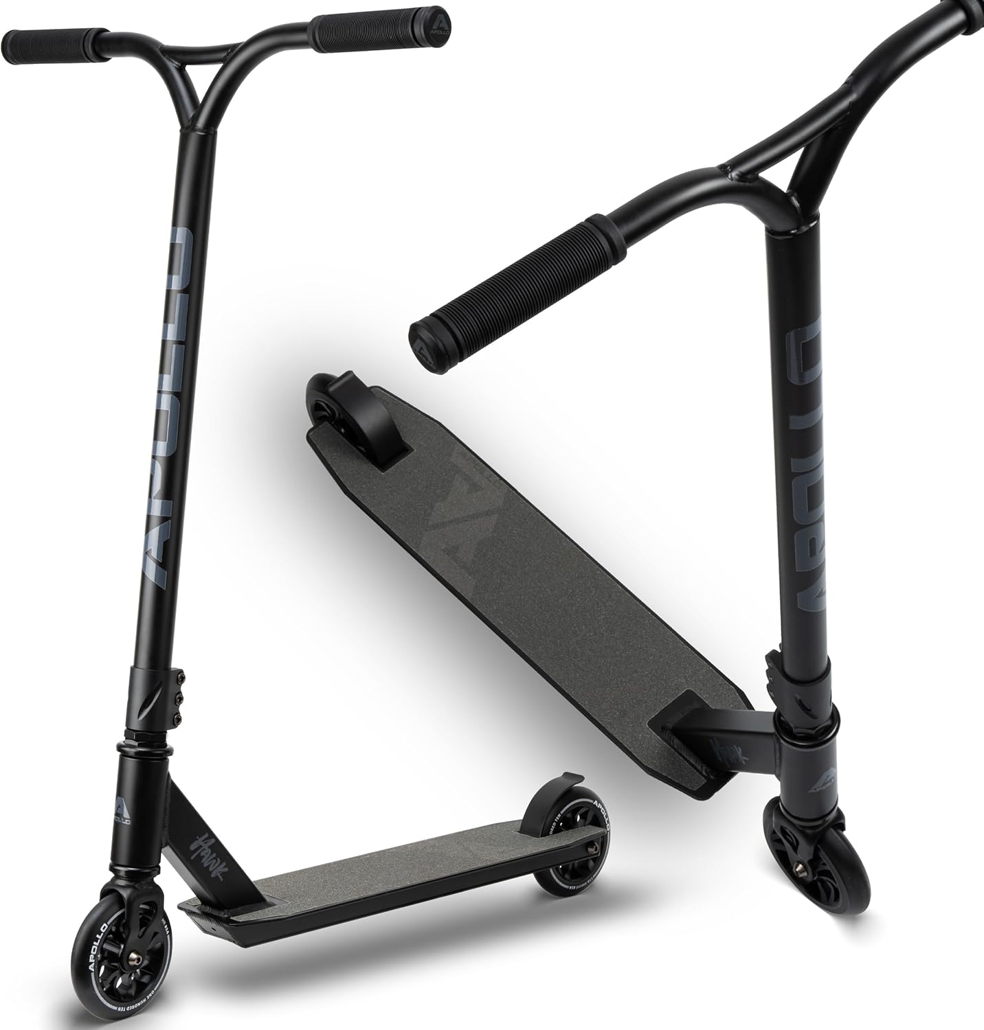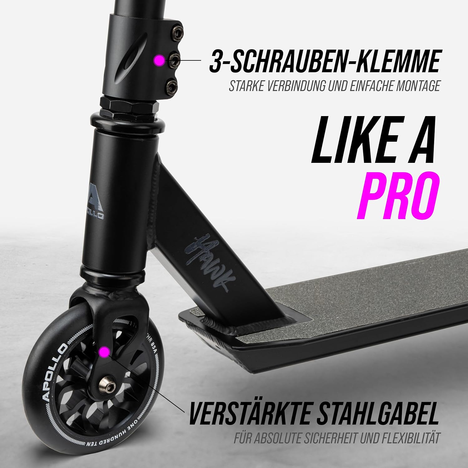- QUALITÄT VON APOLLO: Stunt Roller mit 360° Y-Lenker, dreifach verschraubter Klemme und Stahlgabel - Scooter für Kinder ab 6 Jahre. Durch den stabilen Rahmen belastbar bis max. 100kg.