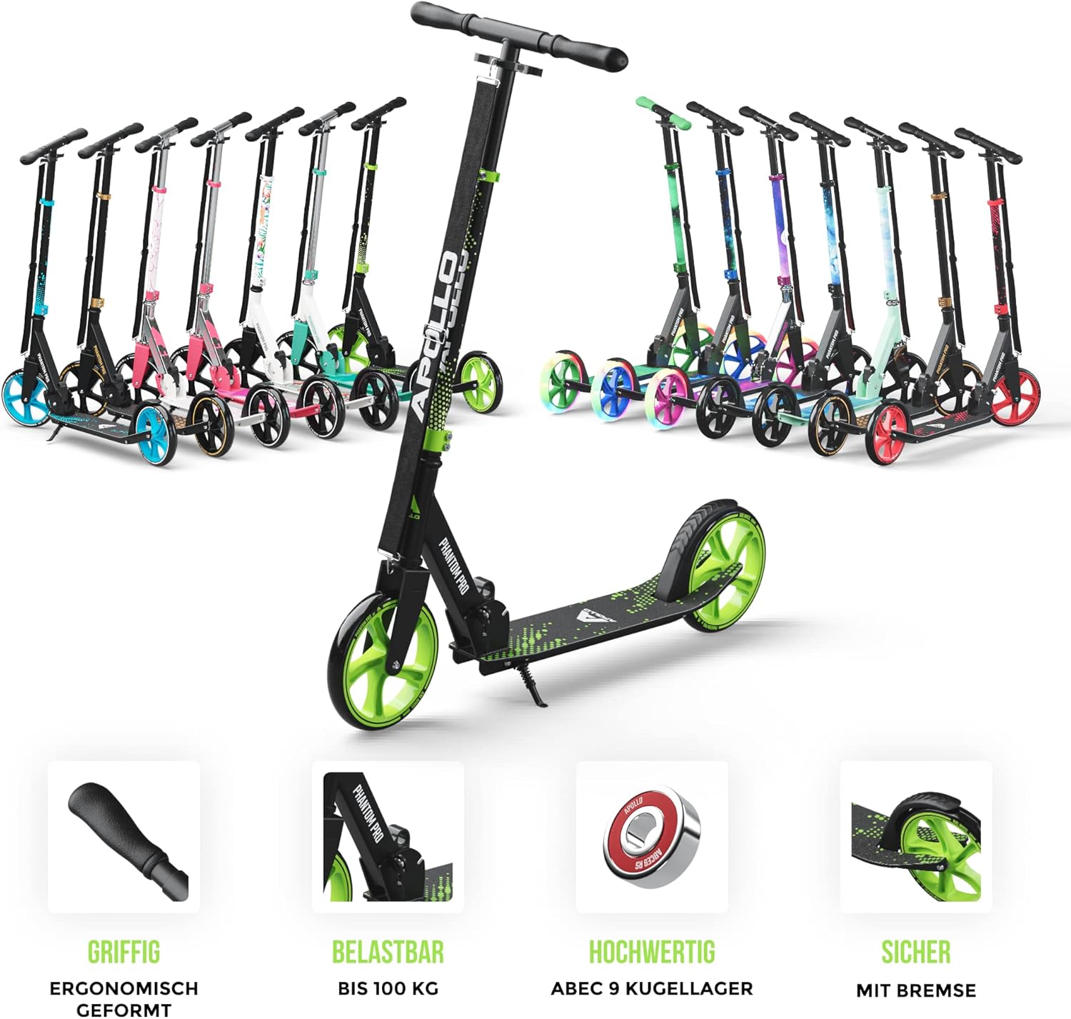 - FAHRSPAss XXL: Apollo Kinder Roller Phantom Pro - ein klappbarer und höhenverstellbarer Kickscooter mit bunten 200 mm XXL LED Wheels, die im Dunkeln leuchten. Ein City Roller für Erwachsene, perfekt für Pendler zum Mitnehmen in Zug, Bus & Bahn