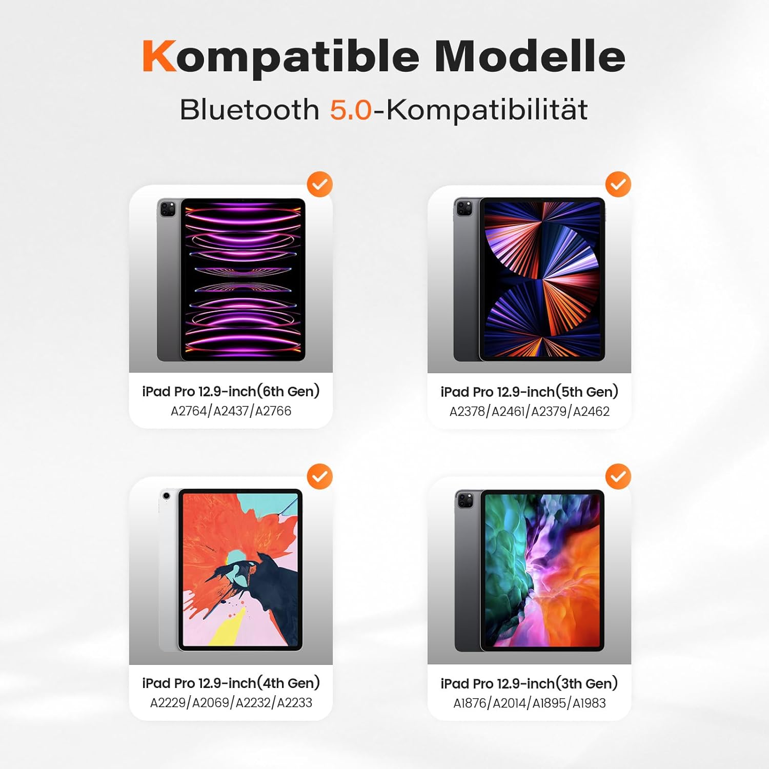 - [Schnelle und stabile Bluetooth-Verbindung] Mit der Bluetooth 5.0-Technologie können Sie sich auf eine schnelle und stabile Verbindung mit der iPad Pro-Tastaturhülle (12,9 Zoll) verlassen und so Ihr kabelloses Tastaturerlebnis nahtlos gestalten.
