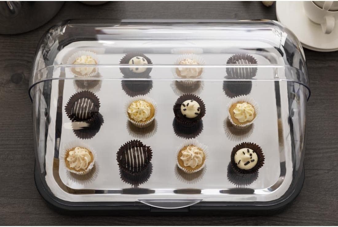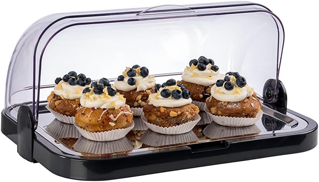 • 🍰 DATEN: Die Vitrine hat die Masse (B x T x H): 44 x 32 x 20,5 cm und wiegt 2,2 kg. Die Basis besteht aus stabilem ABS Kunststoff und wird durch einen glasklaren SAN Rolltopdeckel ergänzt. Zudem verfügt die Vitrine über ein Edelstahl-Tablett und 2