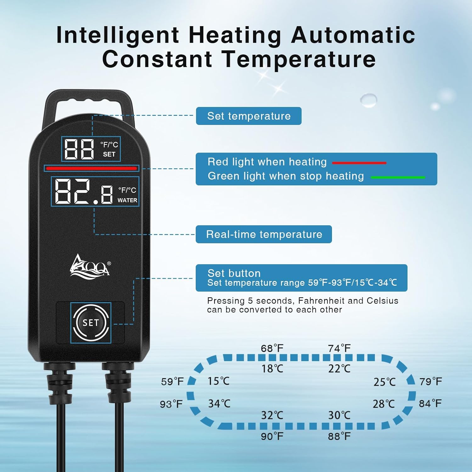 - 🐠【Temperaturbereich 59℉-93℉】AQQA aquarium heizung besteht aus dem stabilsten Nickel-Chrom-Heizdraht, Kann schnell und gleichmässig Wärme abgeben. Es verfügt über ein integriertes duales Temperaturkontrollsystem für Fahrenheit und Celsius.