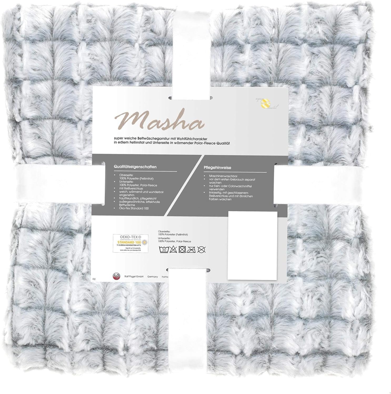 - Sie erhalten den effektvollen Masha Bettdecken Bezug mit zwei Kopfkissenbezügen 80x80 cm. Passend zum Bettwäsche Set führen wir auch Kuscheldecken mit Kunstfell Optik Oberseite