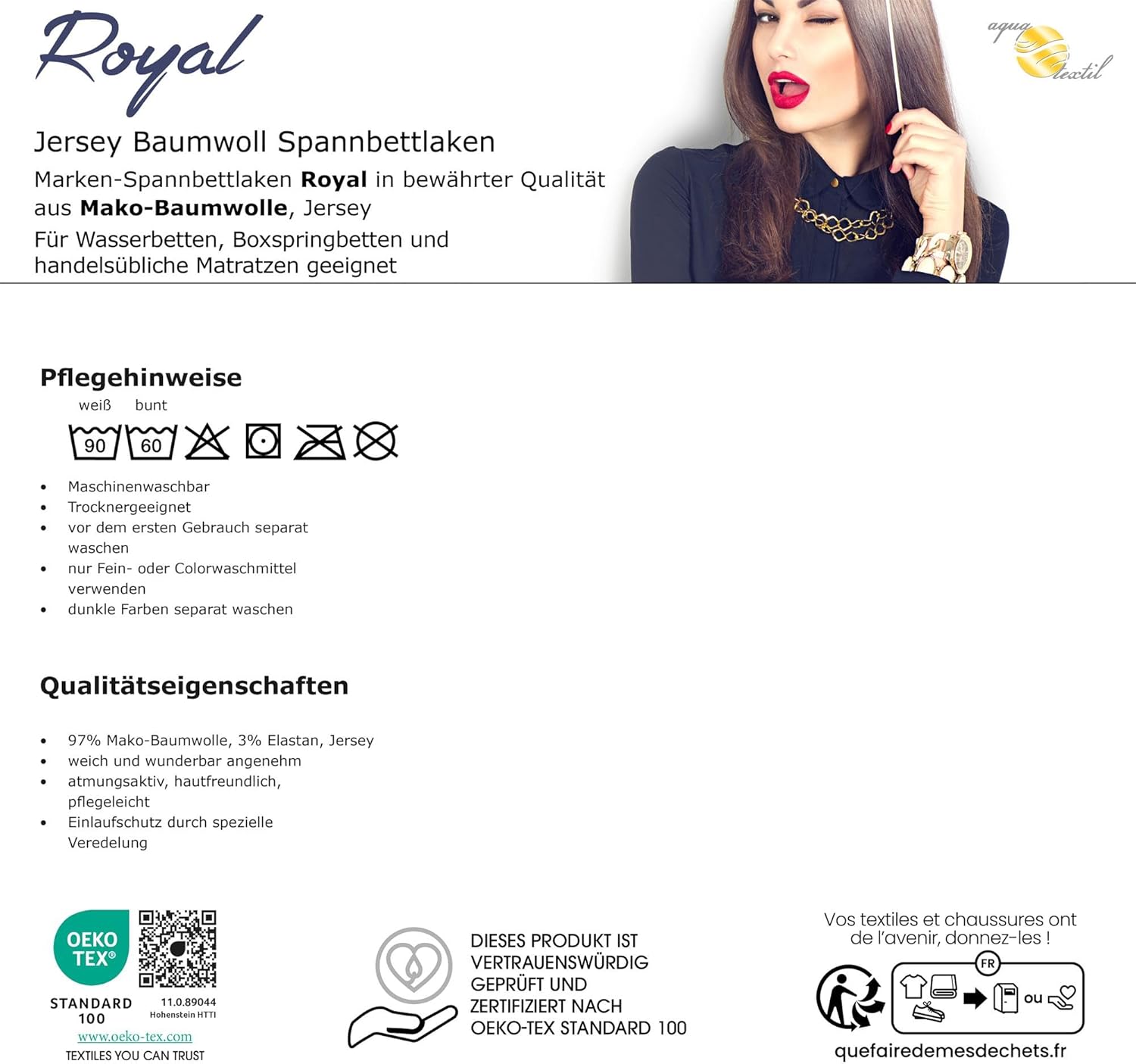- unserer aqua-textil Bettlaken ist formstabil, elastisch und angenehm weich. Ein faltenfreier Halt auf Ihrer Matratze, dank starkem Rundumgummi. Das Jerseylaken ist mit einem Einlaufschutz ausgestattet