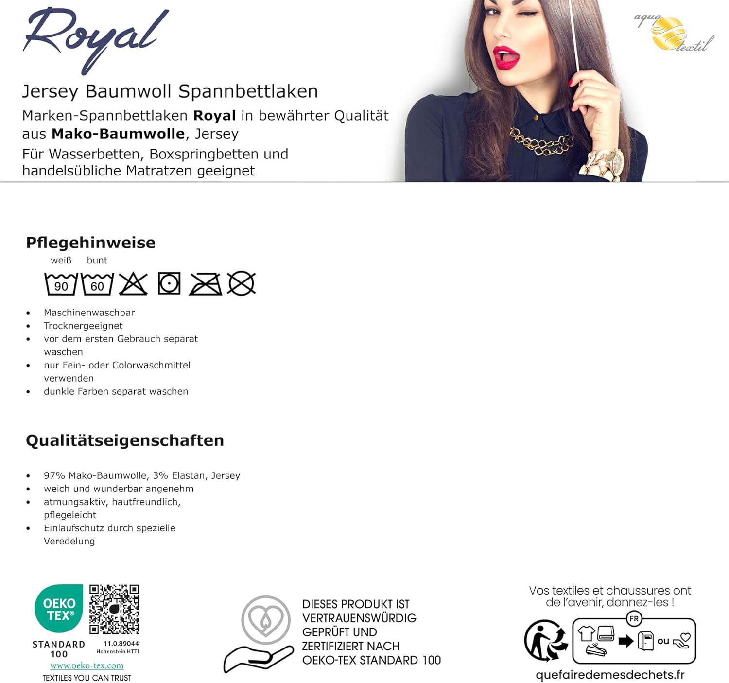 - Marken Spannleintuch aus 97% Mako-Baumwolle, 3% Elastan, Jersey mit einem Gewicht von ca. 210g/qm. Die extralangen Ecknähte sorgen für einen perfekten Sitz. Kennzeichnung Oeko-Tex Standard 100