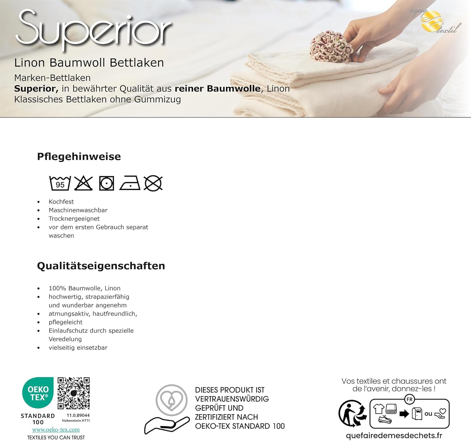 - aus 100% reine Baumwolle, Linon Webart mit einem Gewicht von ca. 180g/qm. Linon ist lange haltbar, strapazierfähig und robust - daher sind Linon-Bettlaken sehr häufig in Hotels zu finden
