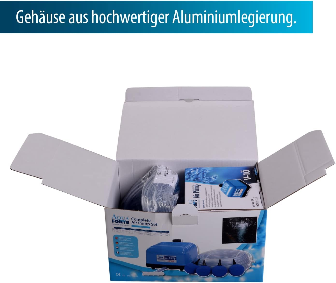 • Komplettes Set bestehend aus V10 Luftpumpe + 25 m Luftschlauch ( 4 x 6mm) + 4x 5 cm Luftstein