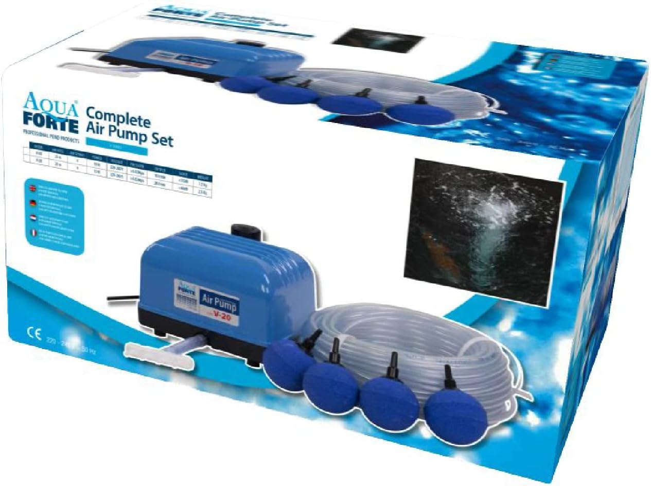 AquaForte Hi-Flow V-10 Luftpumpenset, Komplettset mit Luftverteilern, 25 m Schlauch 4 x 6 mm und 4 L
