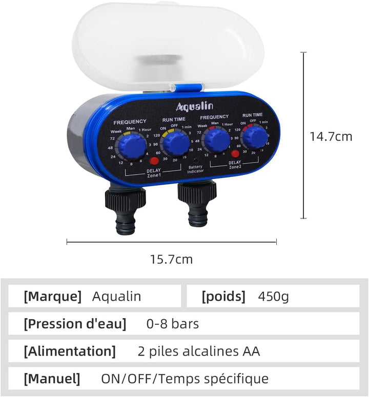 - Zwei Auslässe können unabhängig eingestellt werden. Manuelle Bewässerung ist verfügbar.