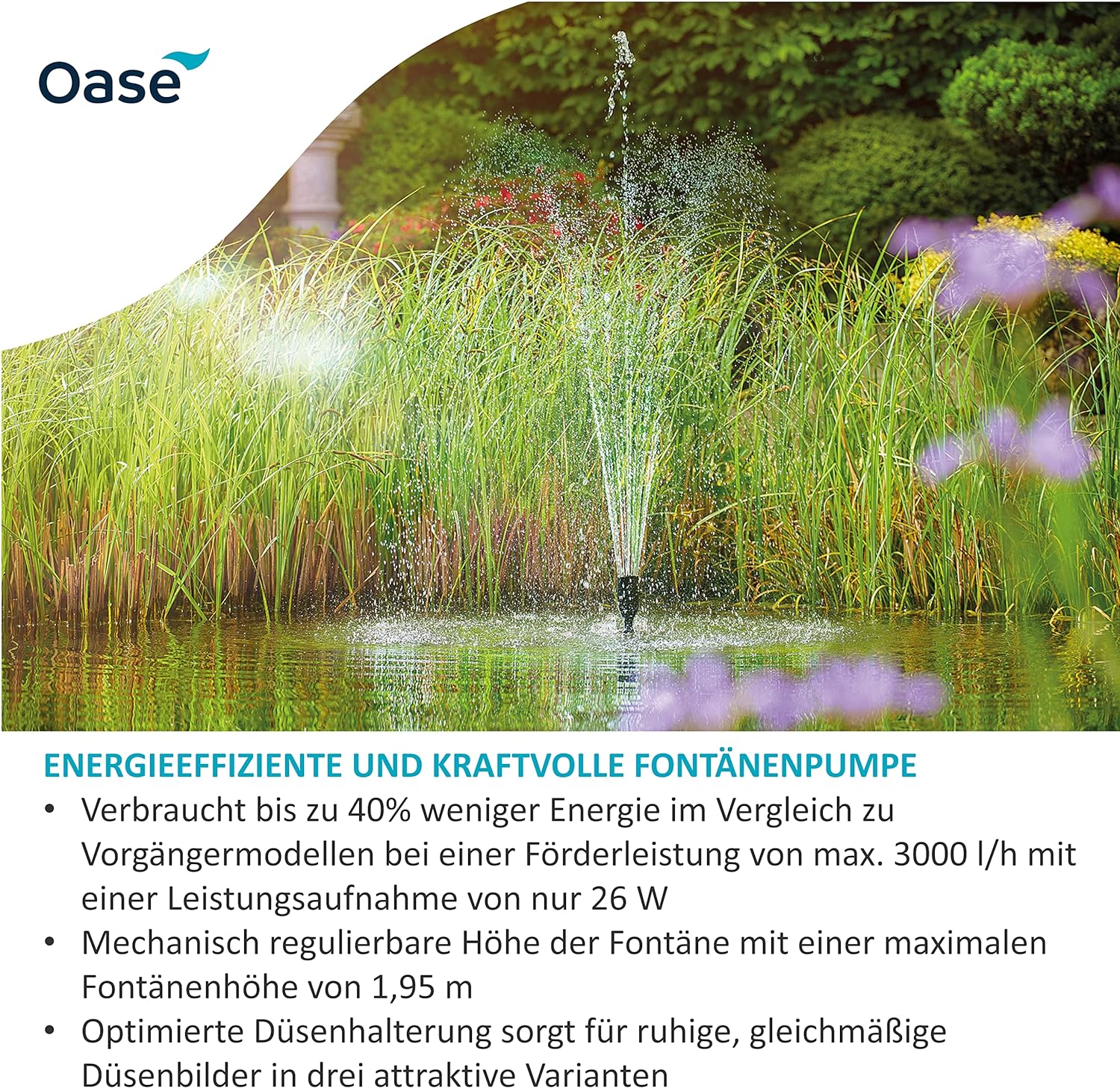 - TECHNISCHE DATEN: Durchflussrate - max. 3000 l/h | Fontänenhöhe - 1,95 m | Leistungsaufnahme - 26 W