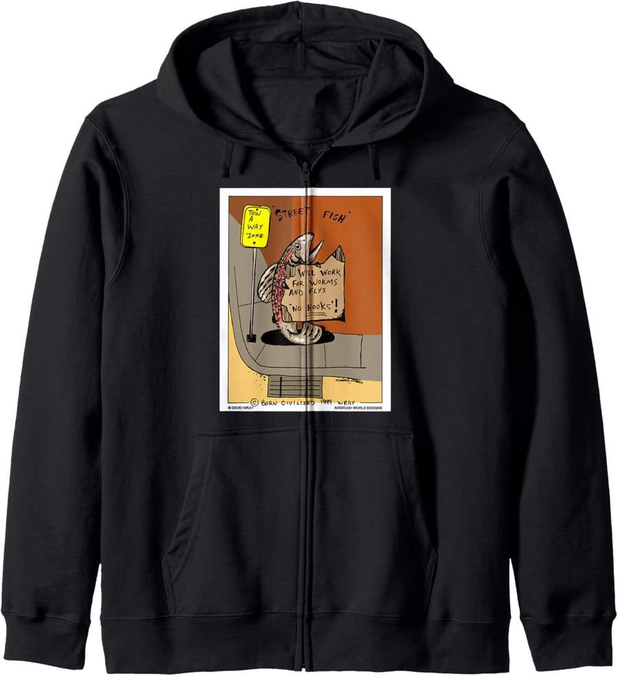 Arbeitslose Fische, die ein Zeichen lustiges Tier halten Kapuzenjacke