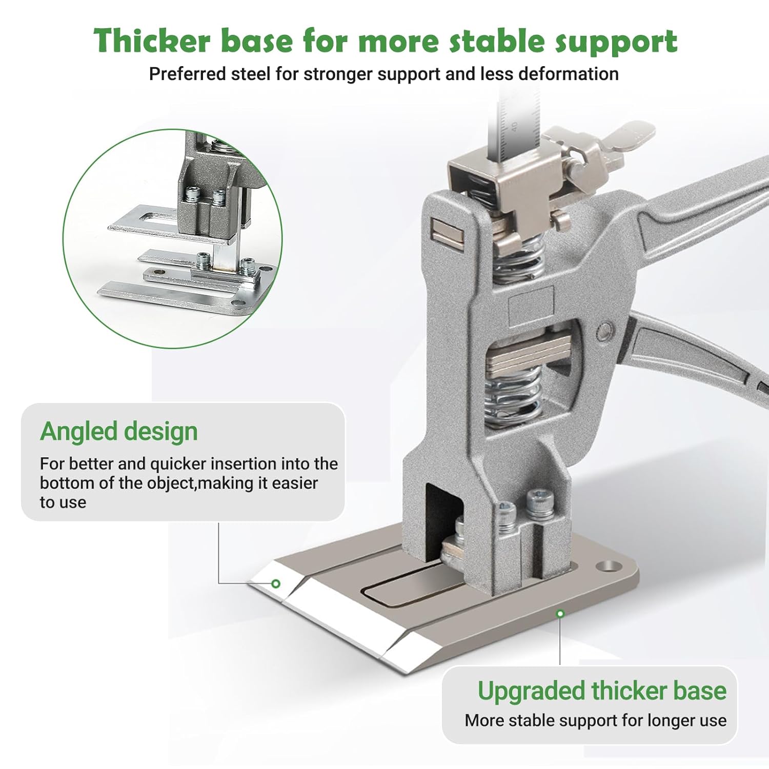- Stabilere, verdickte Basis – bevorzugt dickerer Stahl für besseren Halt und längere Lebensdauer. Die schräge Designbasis kann einfach in die Unterseite des Artikels eingesetzt werden, was die Verwendung bequemer macht. Es handelt sich um einen