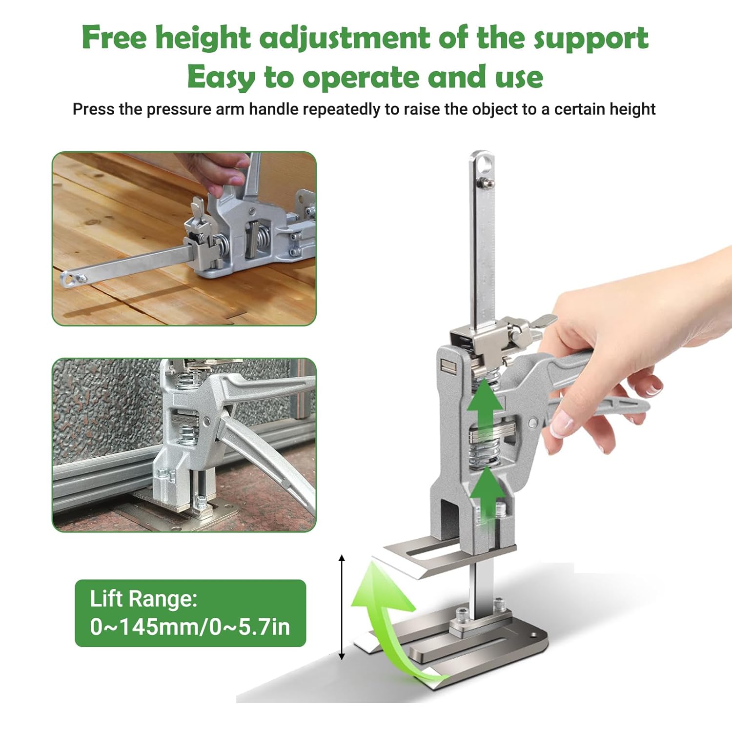 - ARBEITSSPARENDER ARM MIT HÖHENVERSTELLUNG – 2 STÜCK. Der kraftsparende Arm trägt ein Gewicht von bis zu 880 Pfund und hilft so dabei, eine Vielzahl verschiedener Rahmen zu stützen und zu stabilisieren, darunter Terrassen, Böden und