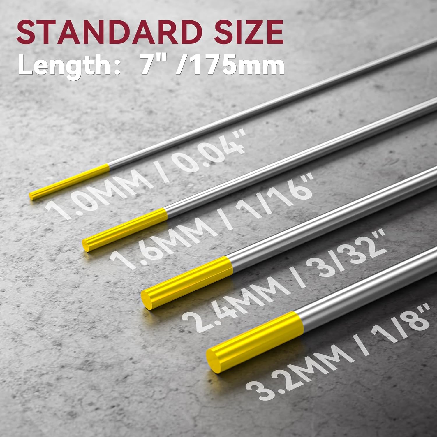 - LIEFERUMFANG: 10er-Pack 3/32"x7" (2,4 mm x 175 mm) lanthanierte tig Wolfram-Schweisselektroden in Gold. Vakuumverpackung, keine Oxidation, langfristige Haltbarkeit.