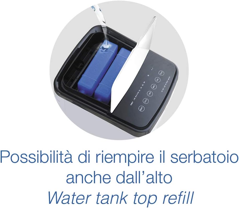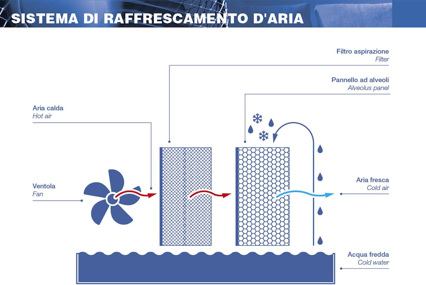 - FUNKTIONEN| Der Dampfluftkühler kann die Raumluft aufnehmen: Nachdem er sie in kaltes Wasser oder Eis kanalisiert hat, stösst er sie wieder zurück ins Zimmer und erzeugt so Kühle und Erleichterung dank des automatischen Schwenkens der vertikalen Lamellen.