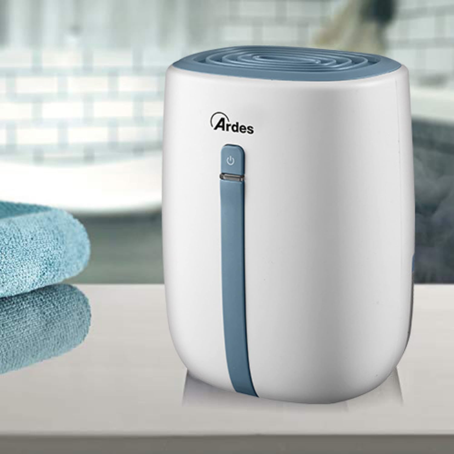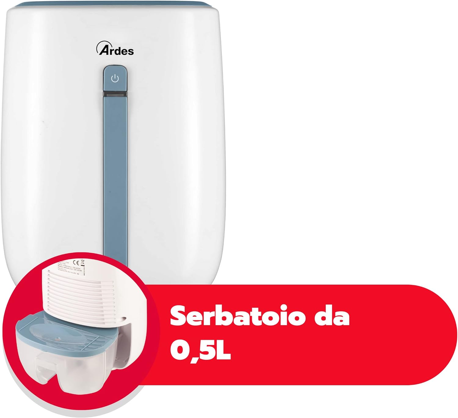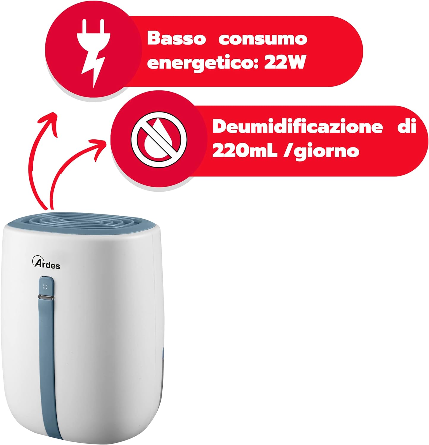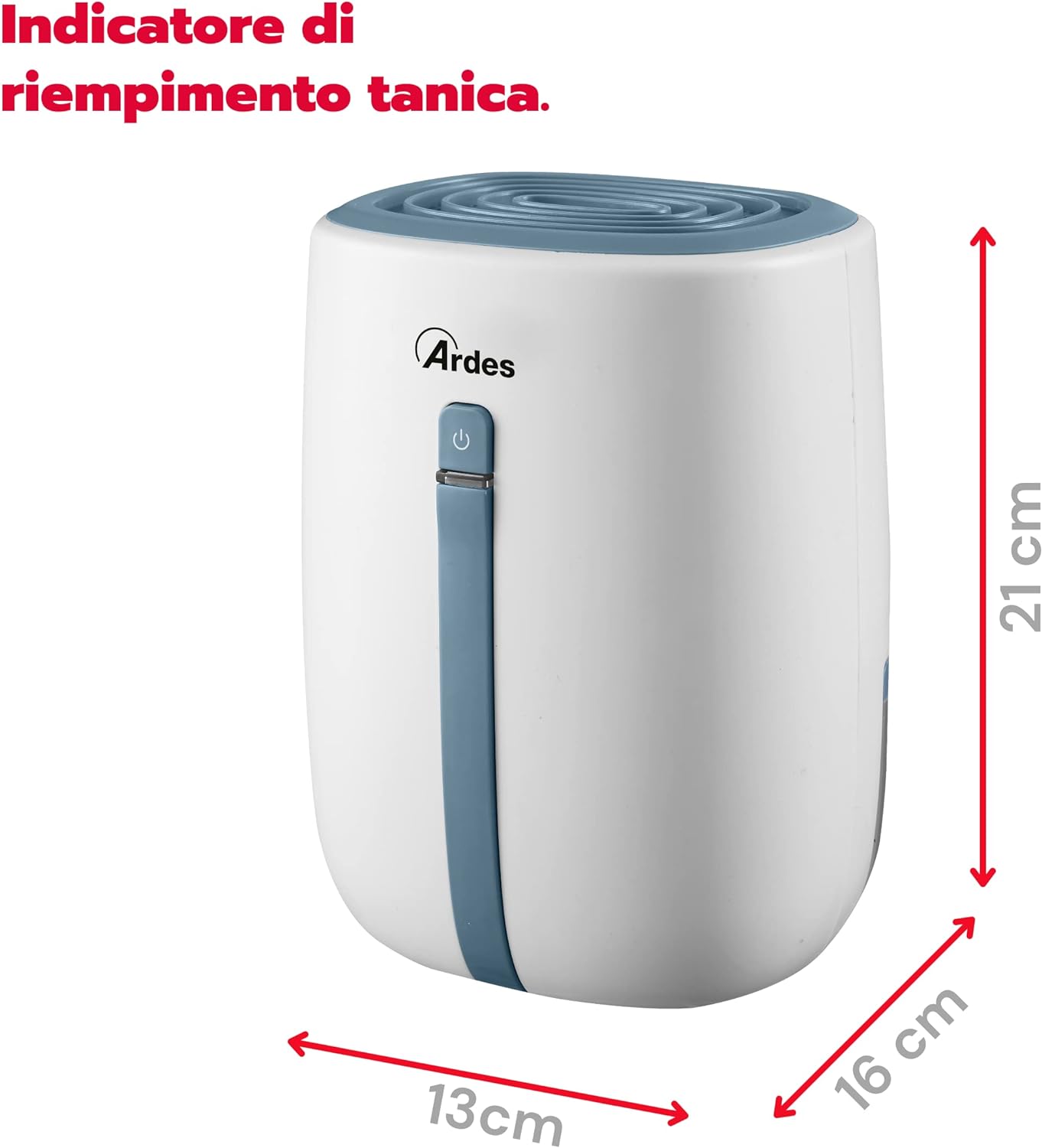 - TECHNISCHE EIGENSCHAFTEN - Die Abmessungen des kompakten Luftentfeuchters von Ardes sind: Breite 16 cm x Länge 13 cm x Höhe 21 cm. Das Fassungsvermögen des Behälters beträgt 0,5 Liter, und die tägliche Entfeuchtung beträgt 220 ml/Tag