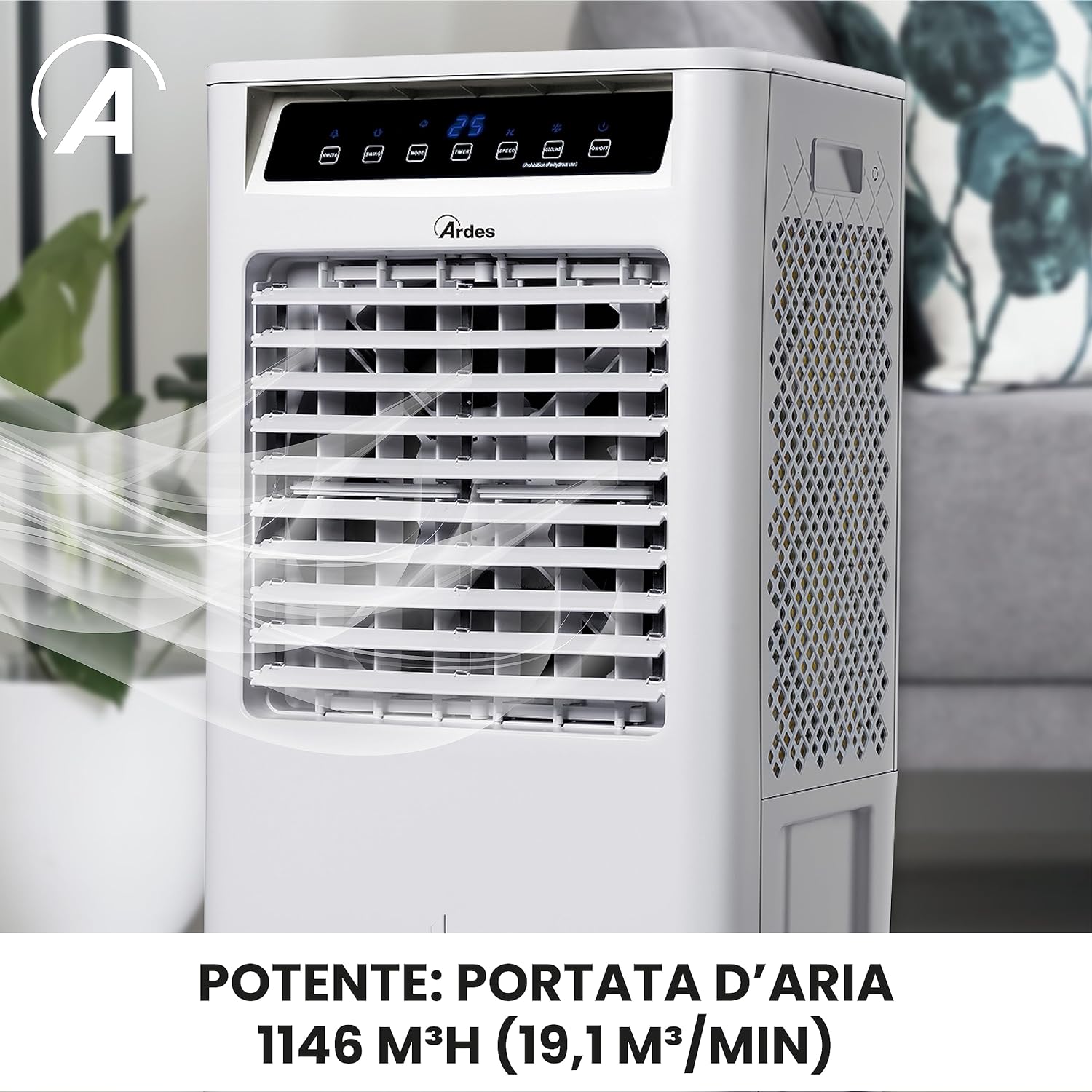 - EIGENSCHAFTEN - Der Ardes-Verdunstungskühler verfügt über ein Touch-Bedienfeld mit 7 Tasten und eine Fernbedienung. Seine Abmessungen sind: 38 cm in der Länge, 30 cm in der Tiefe und 68,5 cm in der Höhe, er hat ein Nettogewicht von 6,3 kg