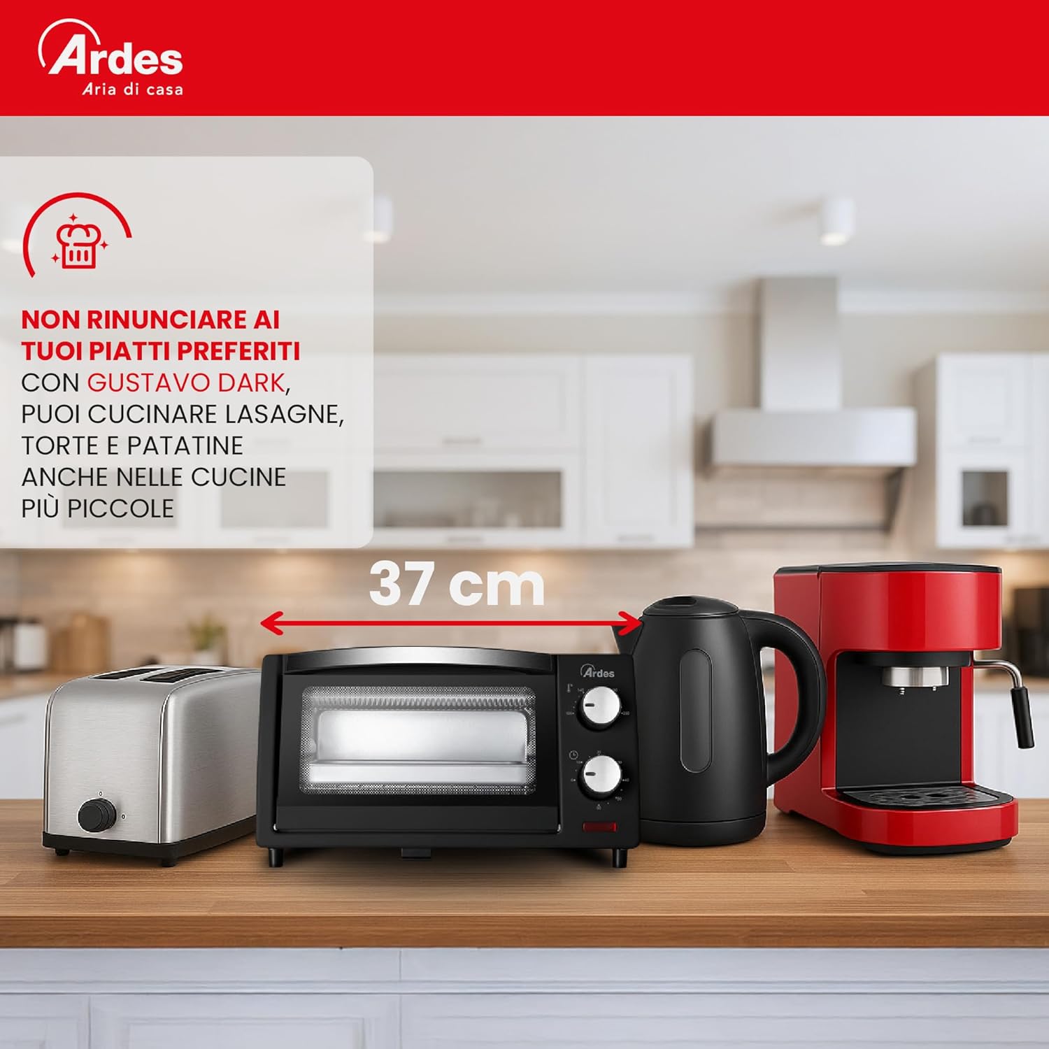 - ABMESSUNGEN UND EIGENSCHAFTEN - Abmessungen des kompakten elektrischen Kleinbackofens: Breite 37 cm x Tiefe 25 cm x Höhe 21,3 cm. Die Garraum-Innenabmessungen sind: Breite 25,2 cm x Tiefe 21 cm x Höhe 16,7 cm