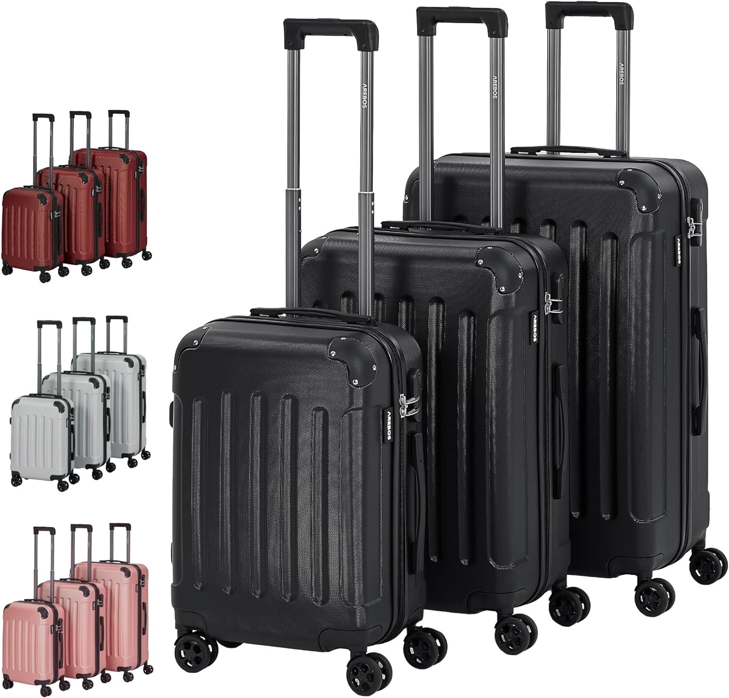- [TRAGEKOMFORT] Jeder Koffer besitzt einen höhenverstellbaren Teleskopgriff und zwei Griffe aus Kunststoff für einfaches Anheben und Tragen. Vier Doppelrollen, die sich um 360° drehen, sorgen für einfache Manövrierfähigkeit.