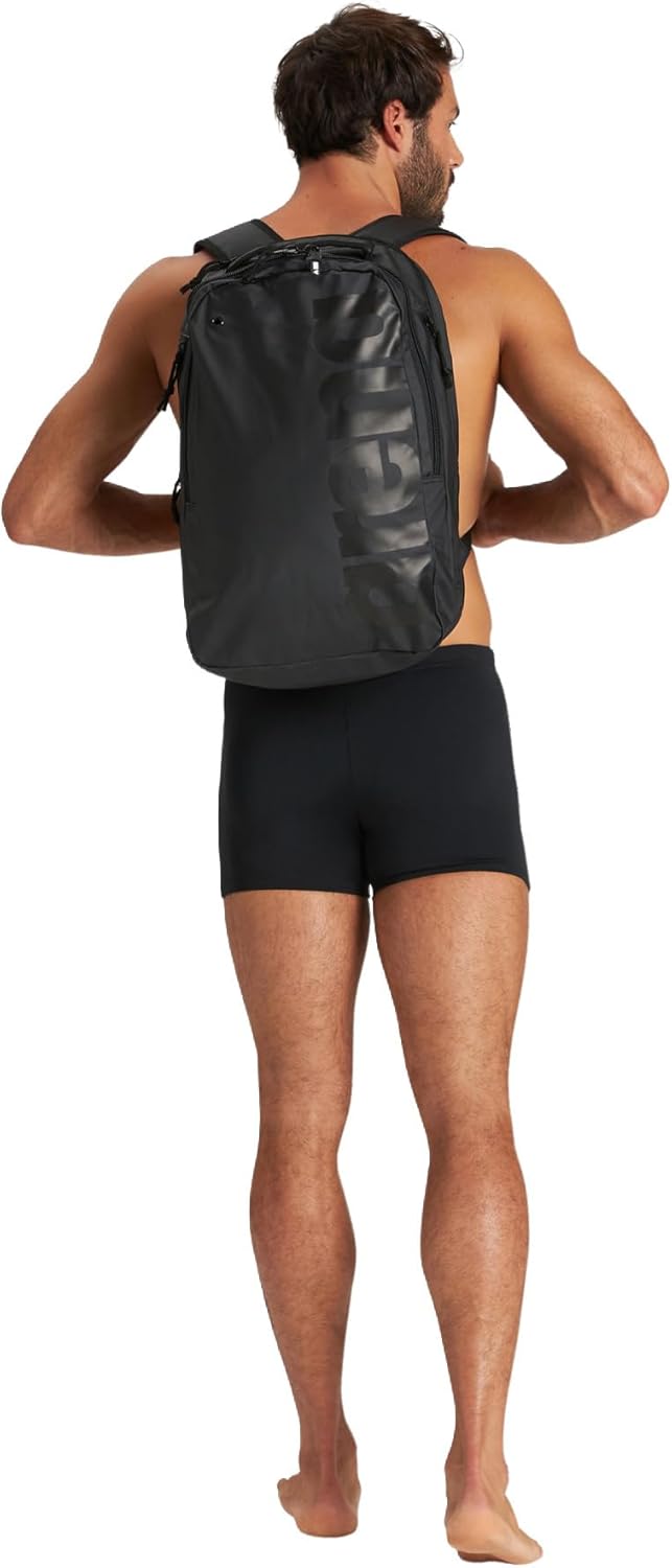 PRODUKTBESCHREIBUNGEN Der stylische arena Rucksack fast Urban 3.0 All Black mit gepolstertem Laptopfach ist ideal für die Arbeit, Sport- und Freizeitaktivitäten und Reisen. Das grosse, atmungsaktive Fach ist perfekt um Trainingsutensilien zu verstauen. Ausgestattet mit separater Tasche für nasse Kleidung und Seitentaschen mit Reissverschluss für grosse Wasserflaschen und Accessoires. Weich gefütterte Tasche mit Reissverschluss auf der Oberseite für Sonnenbrille und Handy. Die gepolsterten Schulterträger hervorragenden Tragekomfort. Masse: 50cm x 30cm x 20cm, 30L.