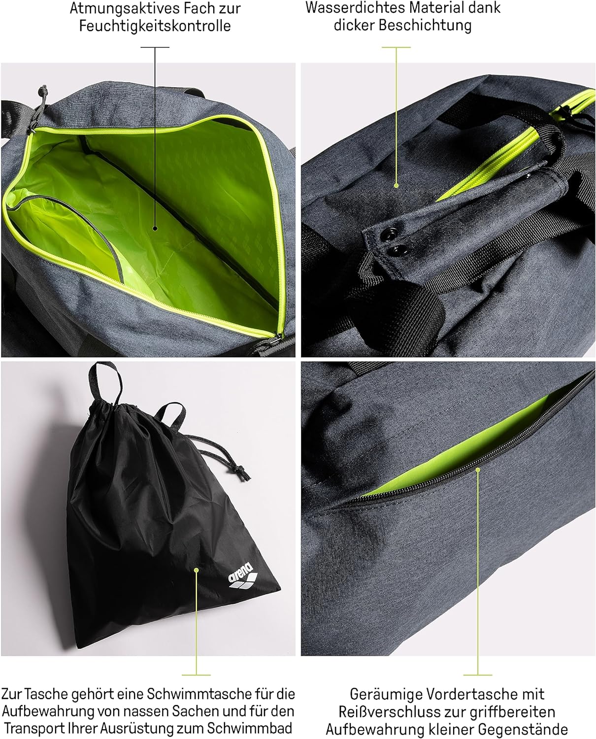 • BEQUEM UND PRAKTISCH: Die grosse und bequeme arena Sporttasche verfügt über einen abnehmbaren Schulterriemen, Seitengriff und komfortable kurze Tragegriffe, die vielseitigen Tragekomfort bieten; ausgestattet mit einer separaten Tasche für nasse Sachen