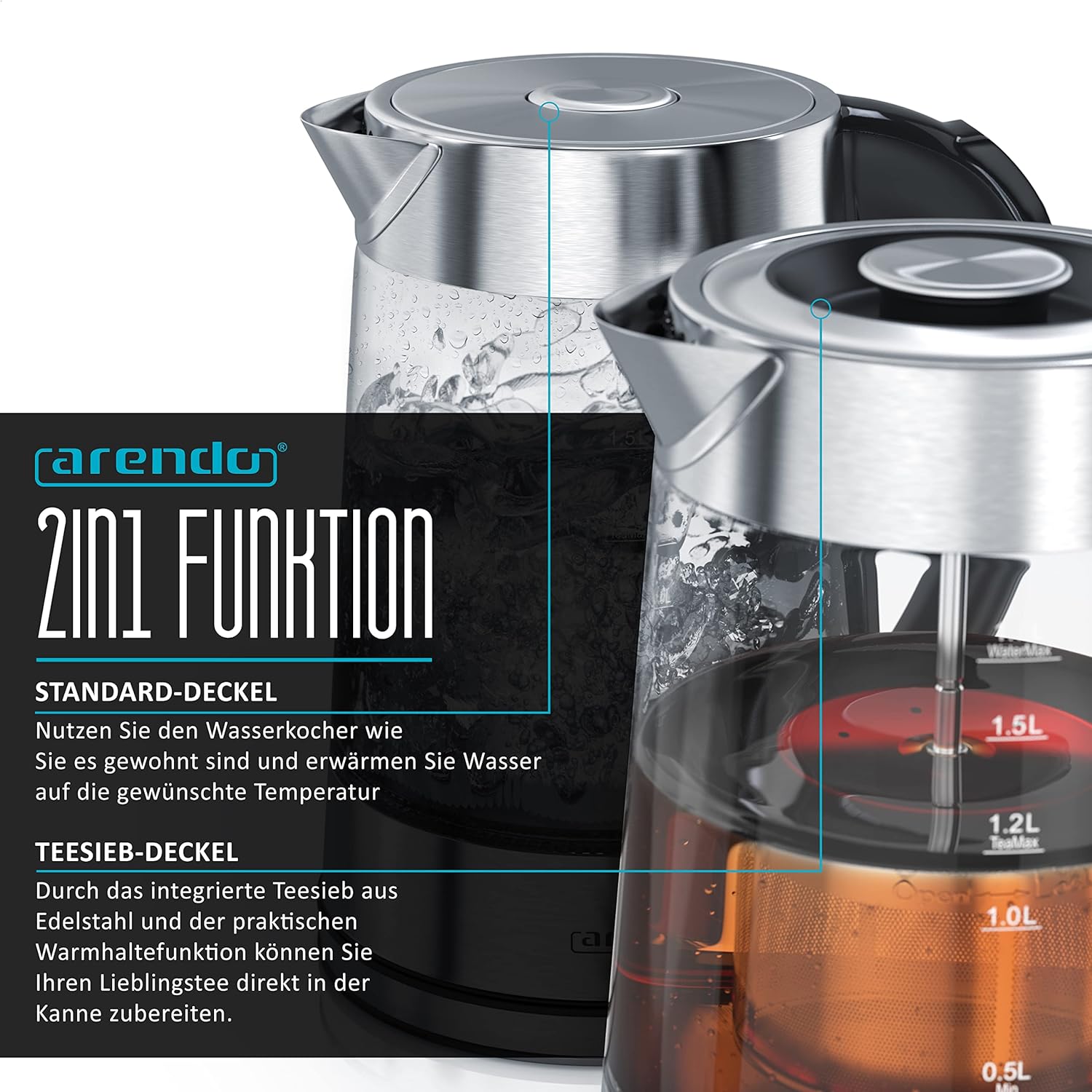 - DER ARENDO INFUSION wendet sich mit seinem integrierten Teesieb aus Edelstahl besonders an Teeliebhaber. Es nimmt gleichermassen grosse Teeblätter und feinkörnigen Rooibos auf. Das volle Aroma entfalten Teesorten bei der richtigen Wassertemperatur, weshalb der Infusion eine vierstufige Temperaturauswahl bereitstellt und die Kochtemperatur bei der Zubereitung per Fühler überprüft. Der 1,7 Liter grosse Glaskörper aus Borosilikatglas erhitzt grosse Wassermengen in kurzer Zeit. GS-zertifiziert. BPA-fr